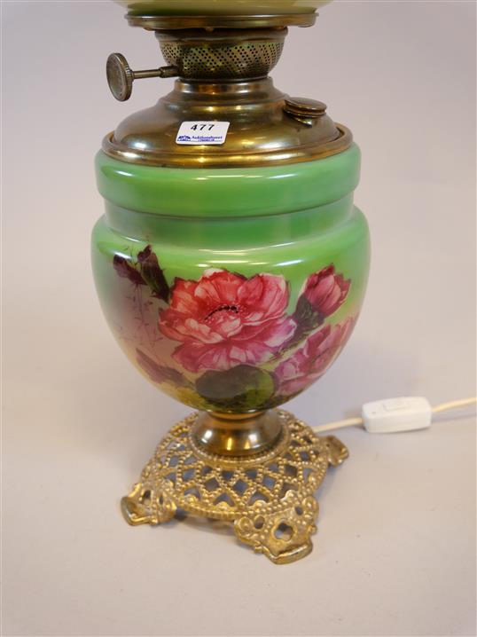 477. BORDSFOTOGENLAMPA, elektrifierad, mässing och bemålat glas i fot och kupa. Totalhöjd 62 cm.