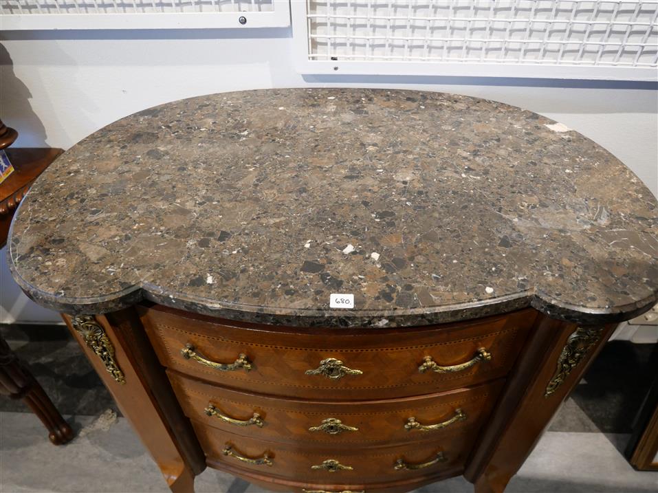 680. BYRÅ MED MARMORSKIVA. Intarsia. H. 89 cm B. 90 cm Djup. 56 cm