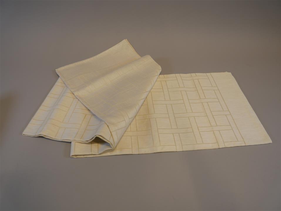 309. KLÄSSBOLS. Duk, servetter 2 st, hellinne. "Flätan", färg champagne. Design. Peter Condu. Duk 250 x 160 cm. Servetter 50 x 50 cm. (Duken med några kaffefläckar).