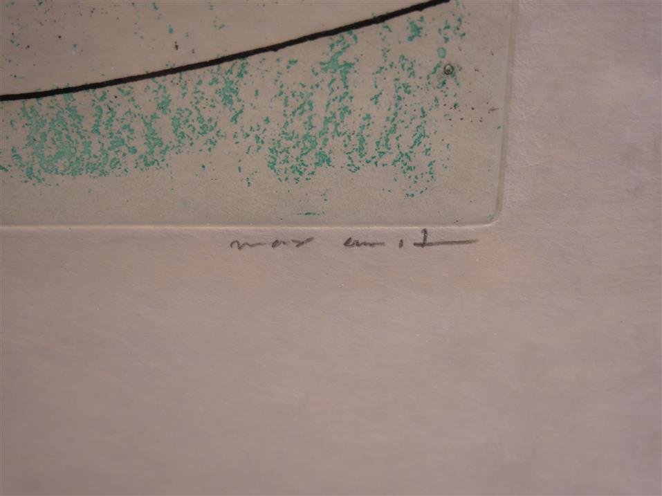 638. MAX ERNST. Akvarinretsning och collage. Signerad Max Ernst 48/100. "Oiseaux en Péril". Bildmått 30,5 x 25,5 cm. Ram med skada