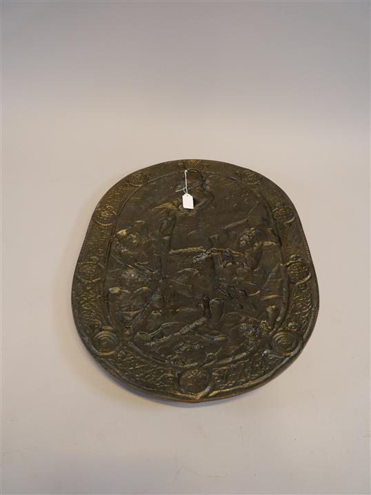 544. SKÖLD. Gjutjärn. Tors kamp mot jättarna. L. 69 cm B. 50 cm
