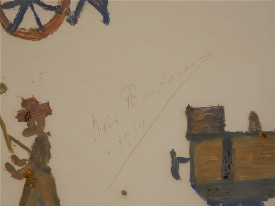 382. NILS RUNDGREN "Björnjägarn". Tavla blandteknik, sign Nils Rundgren 1968. Tavlans mått 31 x 29,5 cm.