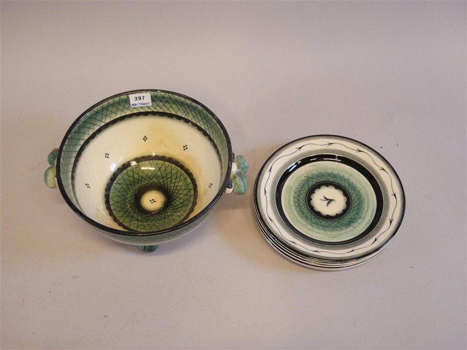 397. Rörstrand, I Claesson. Skål med missfärgninar och 5 assietter Diam 18,5 cm.