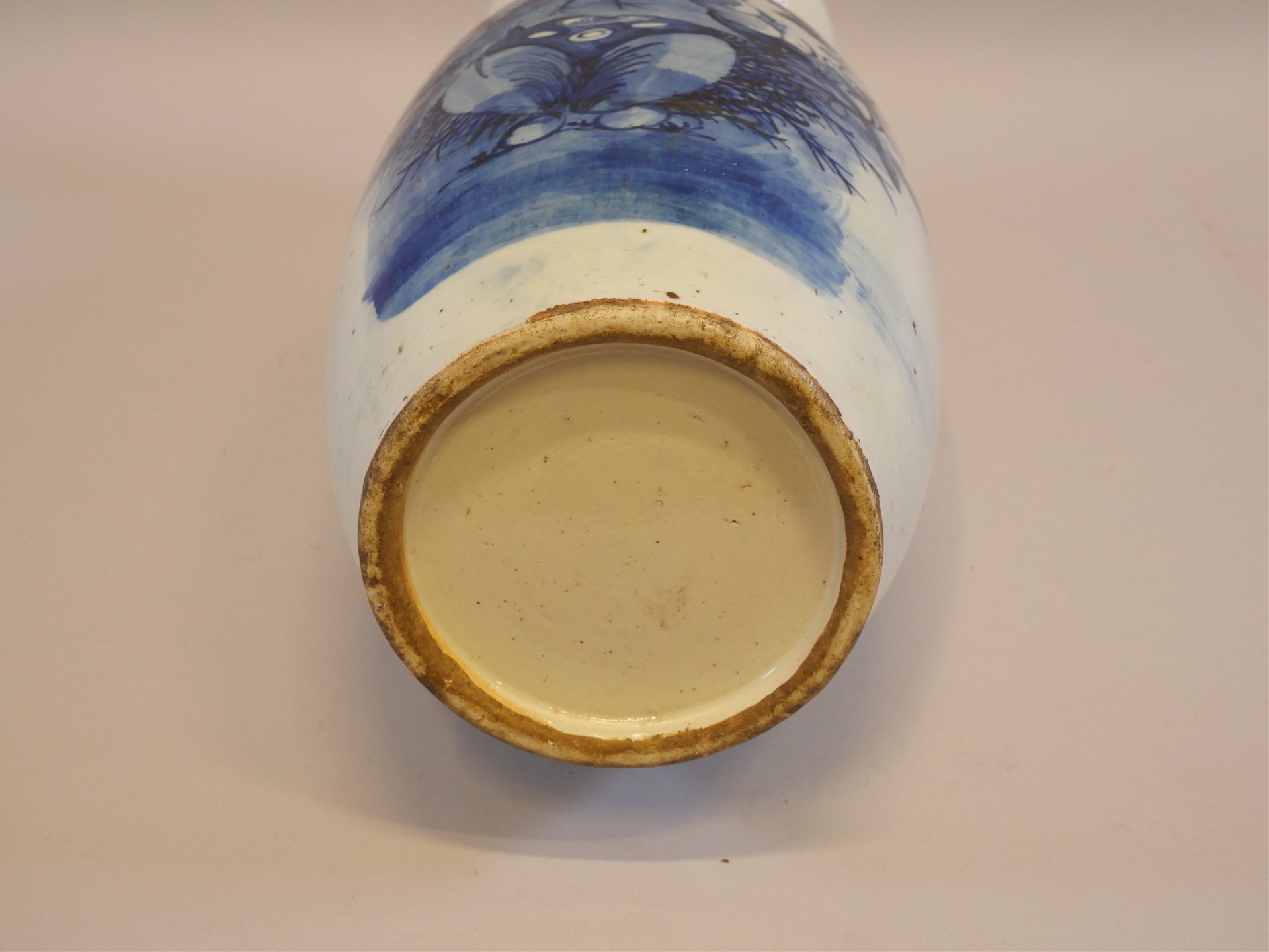 244. GOLVVAS, porslin, Kina, Qingdynastin, sekelskiftet 1900. Dekor i underglasyrblått med motiv föreställande påfåglar, blommor och andra växter. Nagg på brättets insida. H. 58 cm.