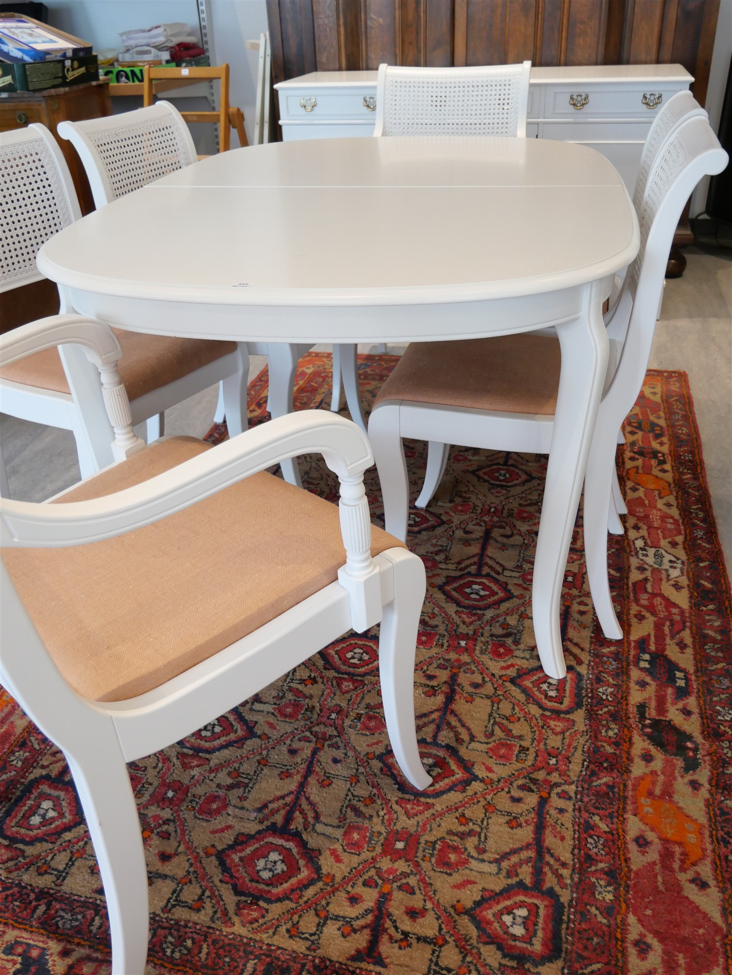 394. MATSALSBORD med 2 iläggsskivor, 2 karmstolar och 4 stolar. Bordets mått: H 74 cm. L 136 2 x 55 cm. B 94 cm.