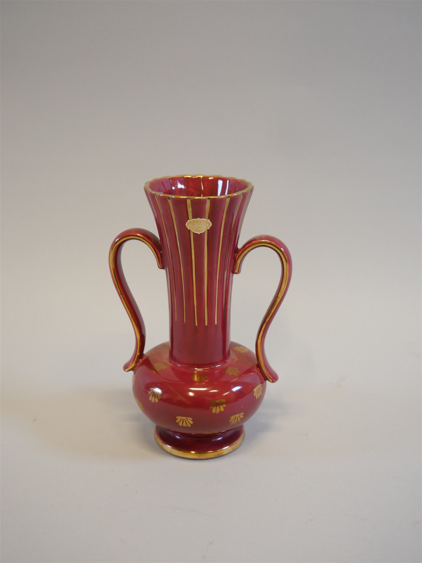 132. RÖD RUBIN. Vas och ljusstakar 1 par H 22 resp 10 cm.