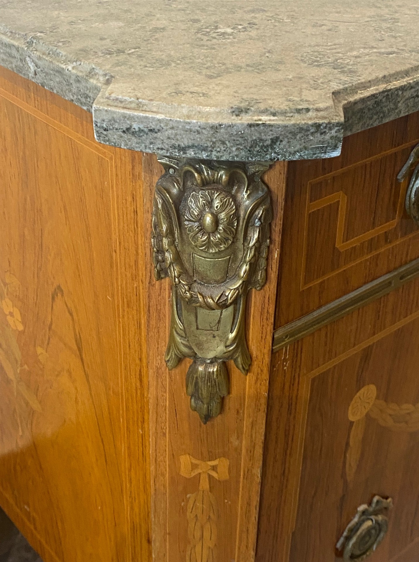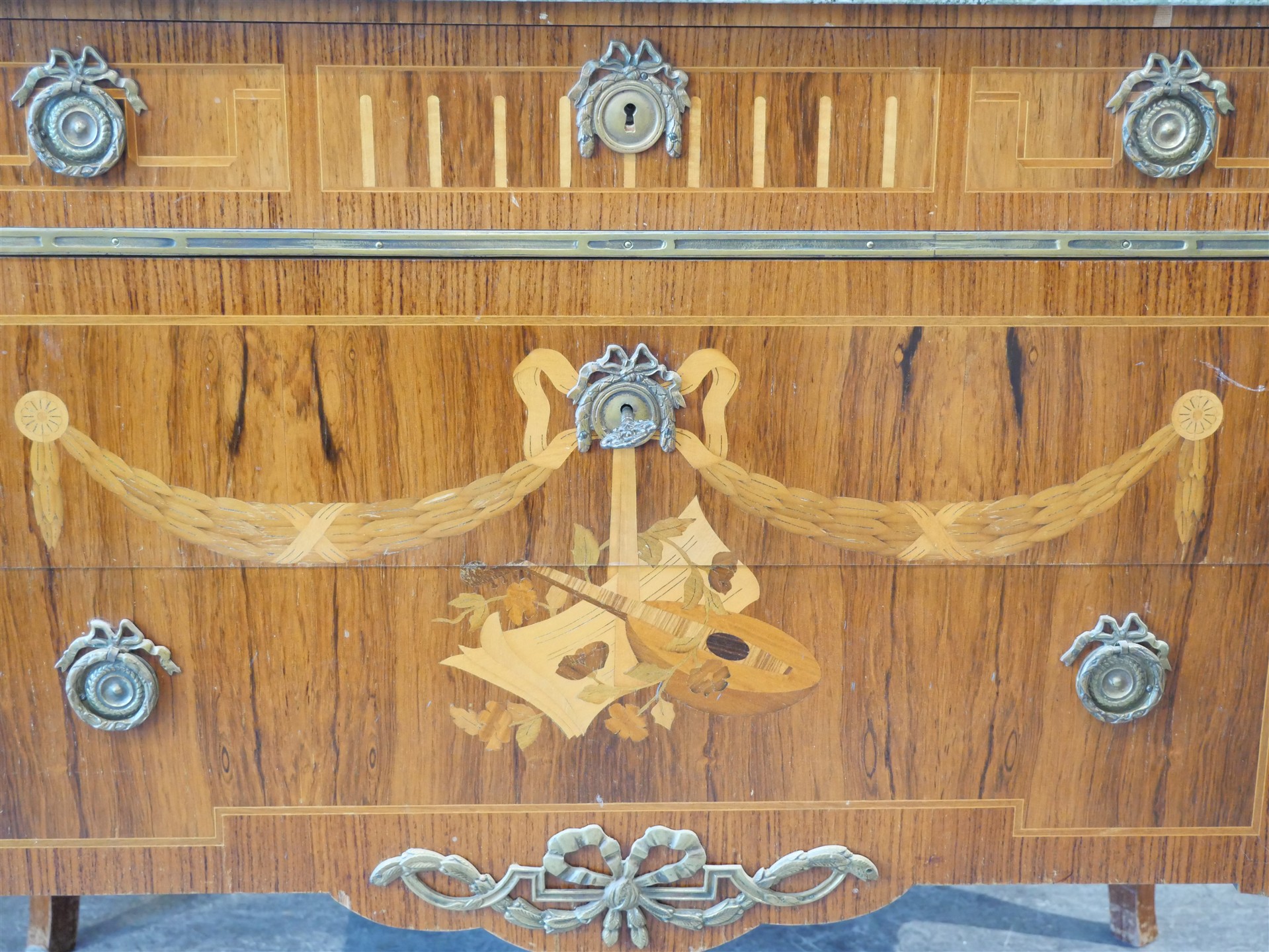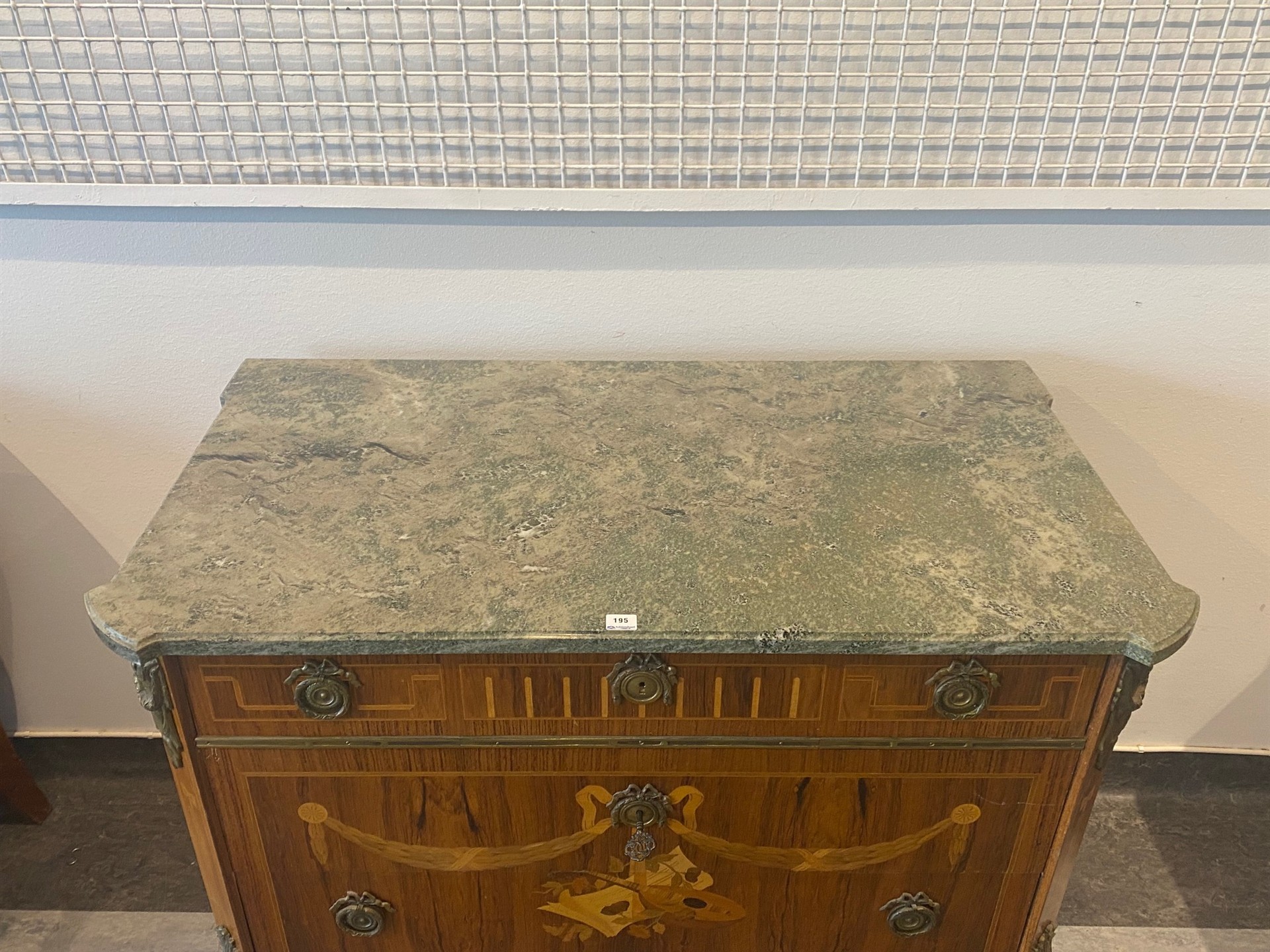 195. BYRÅ M MARMORSKIVA, intarsia med olika träslag. Gustaviansk stil. H. 83 cm. B. 97,5 cm. Djup 52 cm.