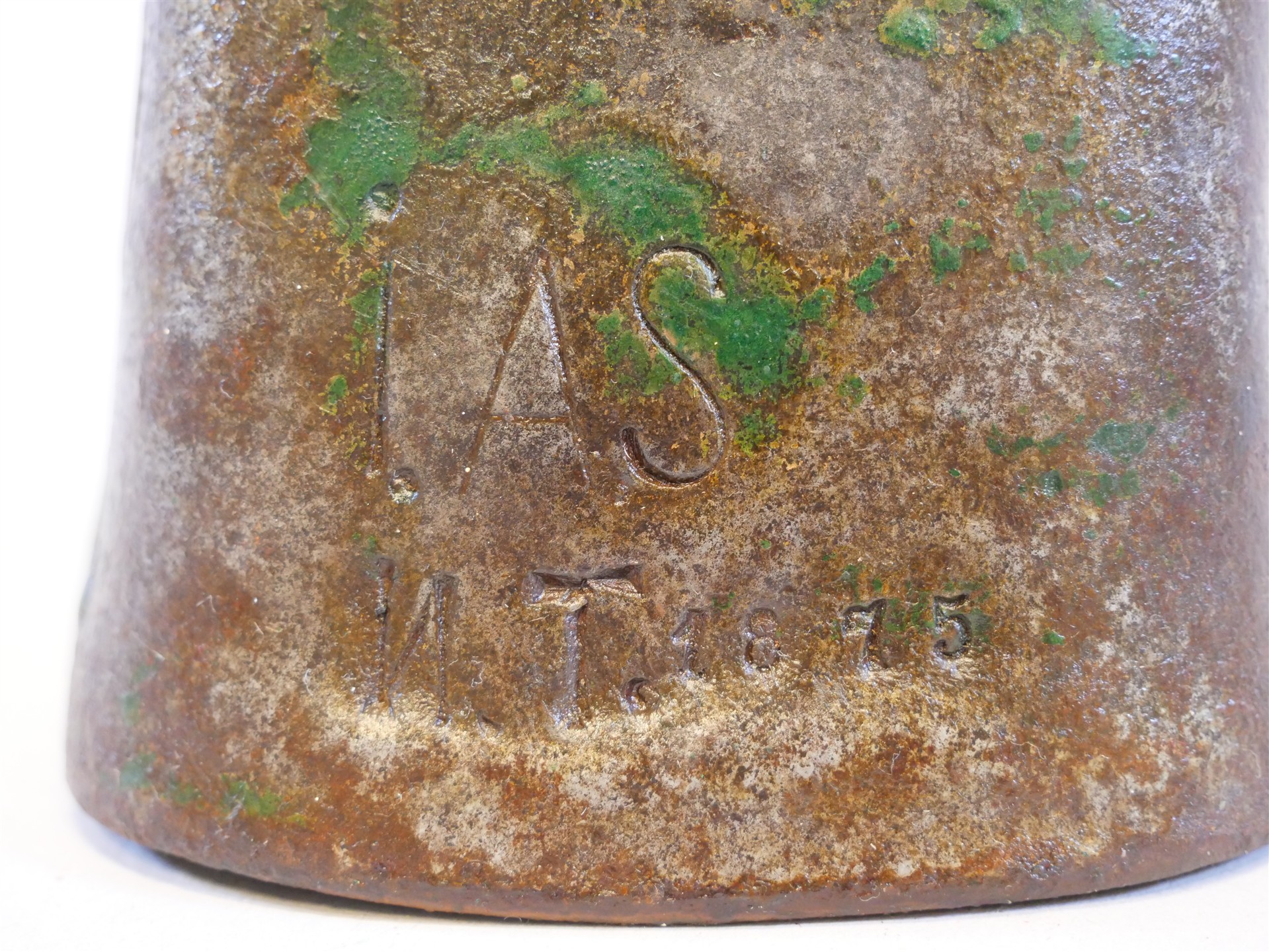 240. GJUTJÄRNSMORTEL H 11,5 cm. Bjällror 2 st. En märkt: 1875