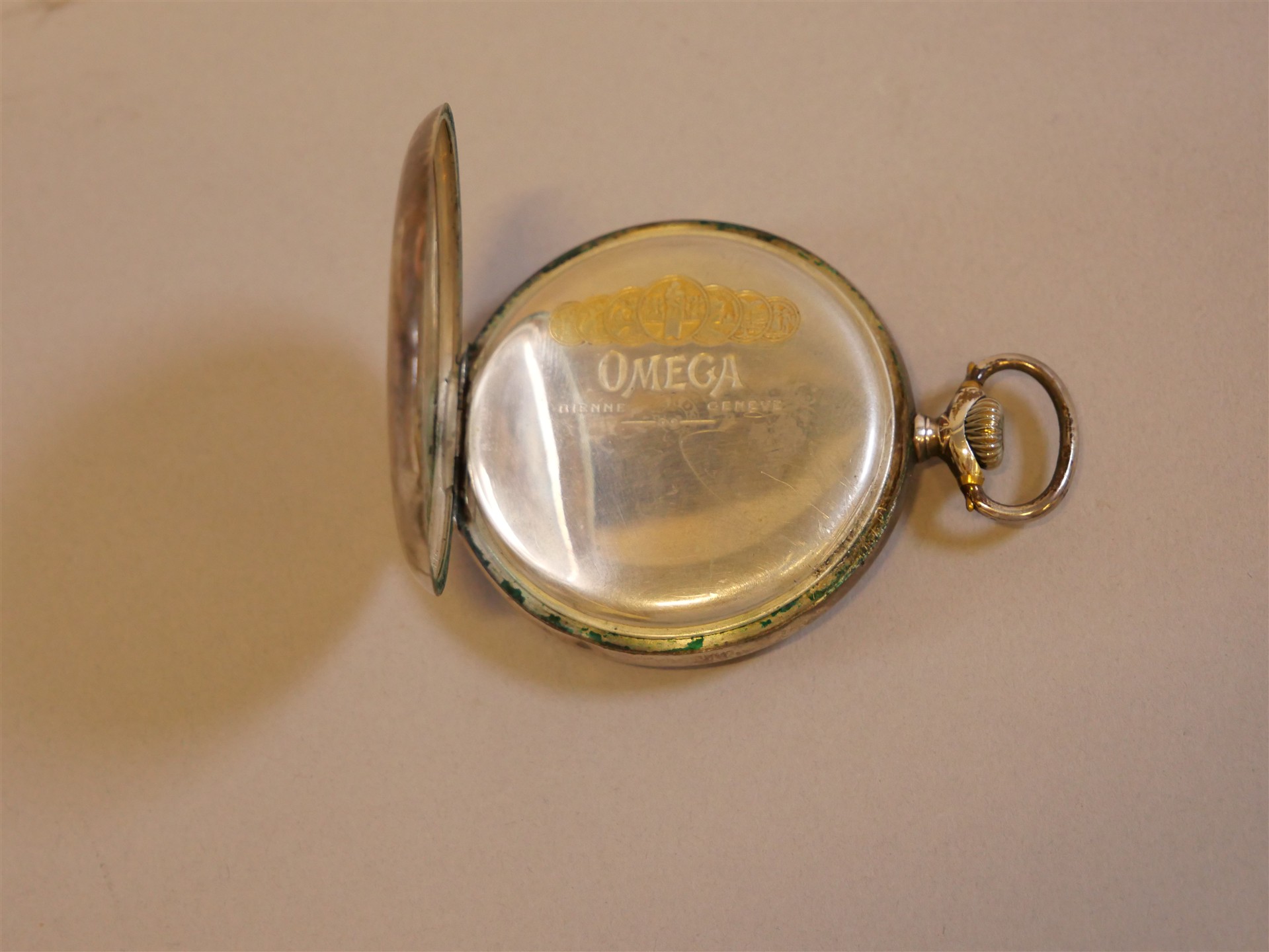 086. OMEGA, fickur, glas samt visare saknas. 800 silver.