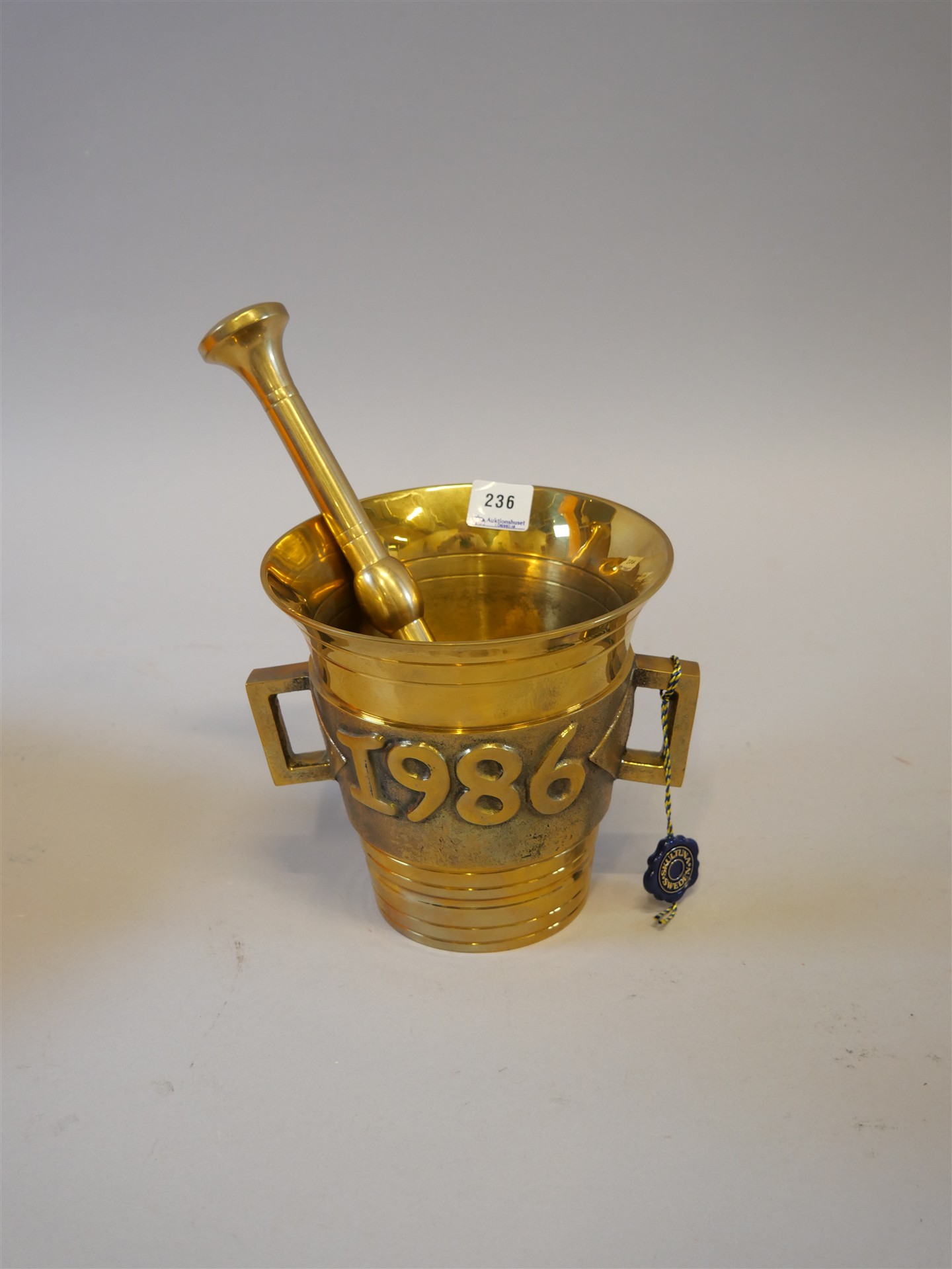 236. MORTEL, mässing, Skultuna. År 1985, 1986,. Nr. 10. "Fyrkövern".H. 15 cm.