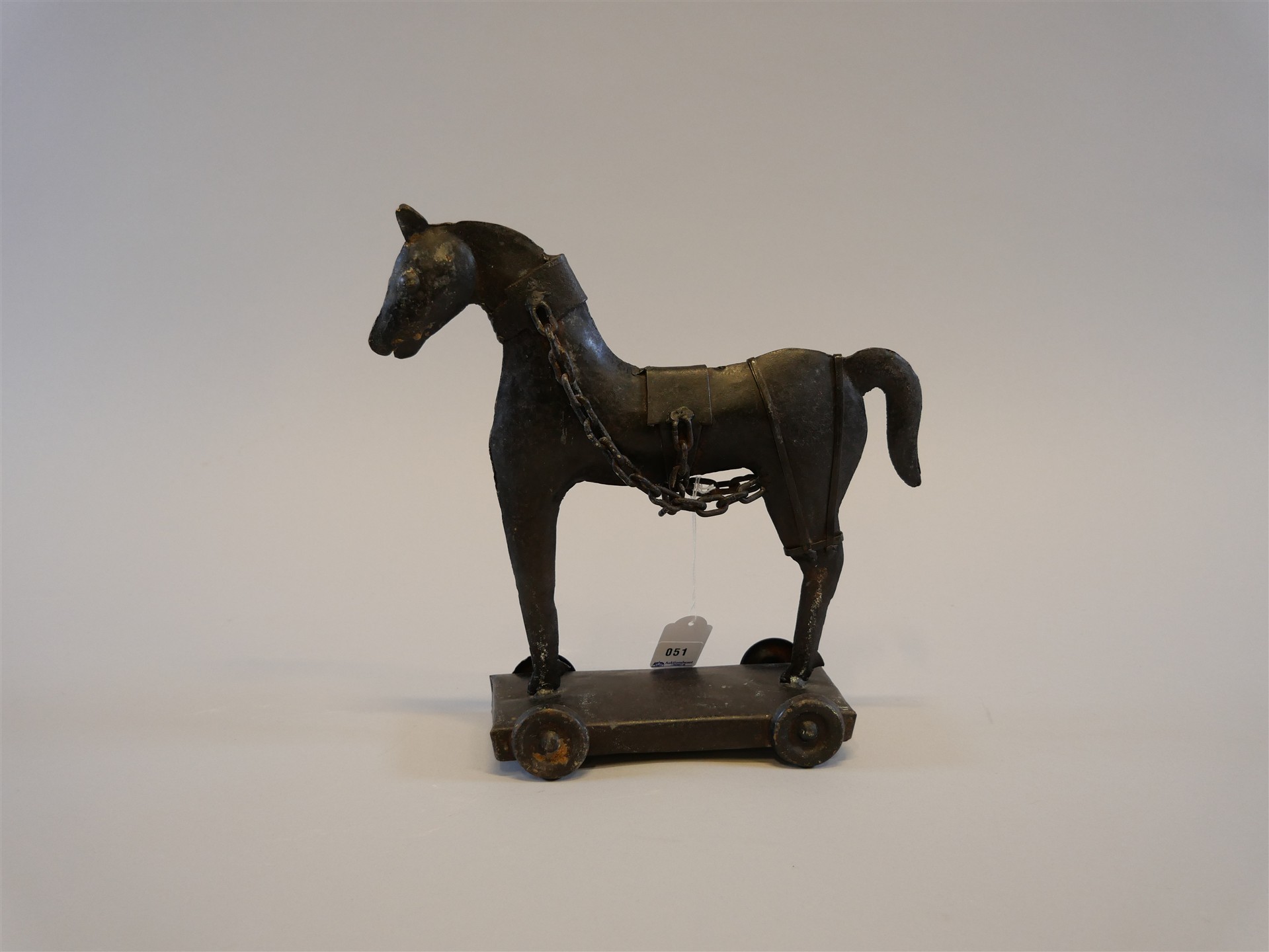 051. HÄSTSKULPTUR, metall. H 28 cm. BIL metall (ett hjul löst).
