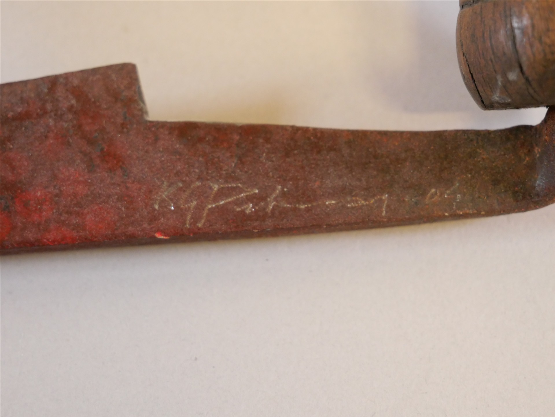 067. TIMMERMANSREDSKAP, Konstverk, sign KG P.... -04. L 47 cm. H 14 cm