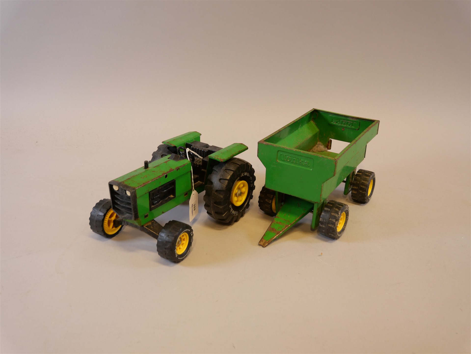 308. TONKA. Leksakstraktor med släp. Väl använd. Släpet med skada. Traktorns längd 26 + 29 cm.
