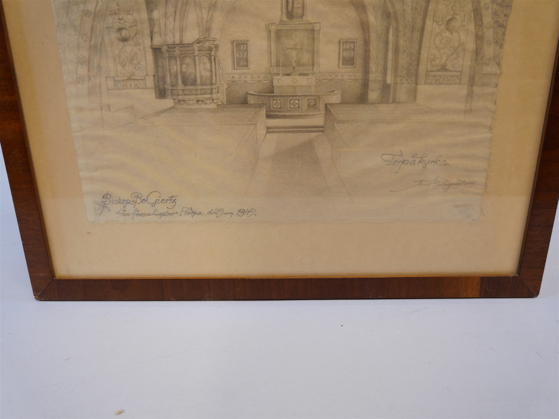 319. ARVID HELLQUIST. Teckning sign Arvid Hellquist 1949 "Torpa Kyrka". Tavlans mått 47 x 44 cm.