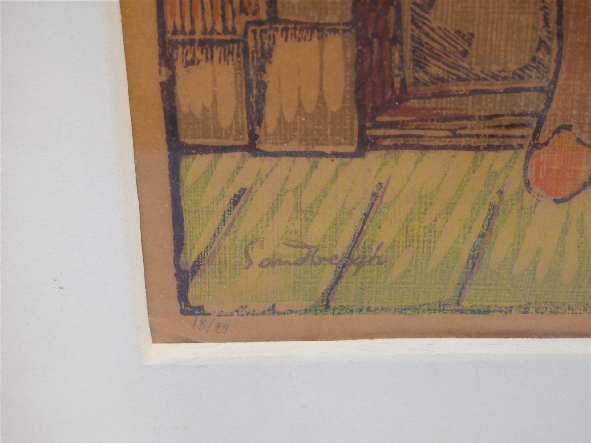 320. SANDBERGH. Kolorerad träsnitt. Sign Sandberg 18/29, 1950. Tavlans mått 66 x 33,5 cm.