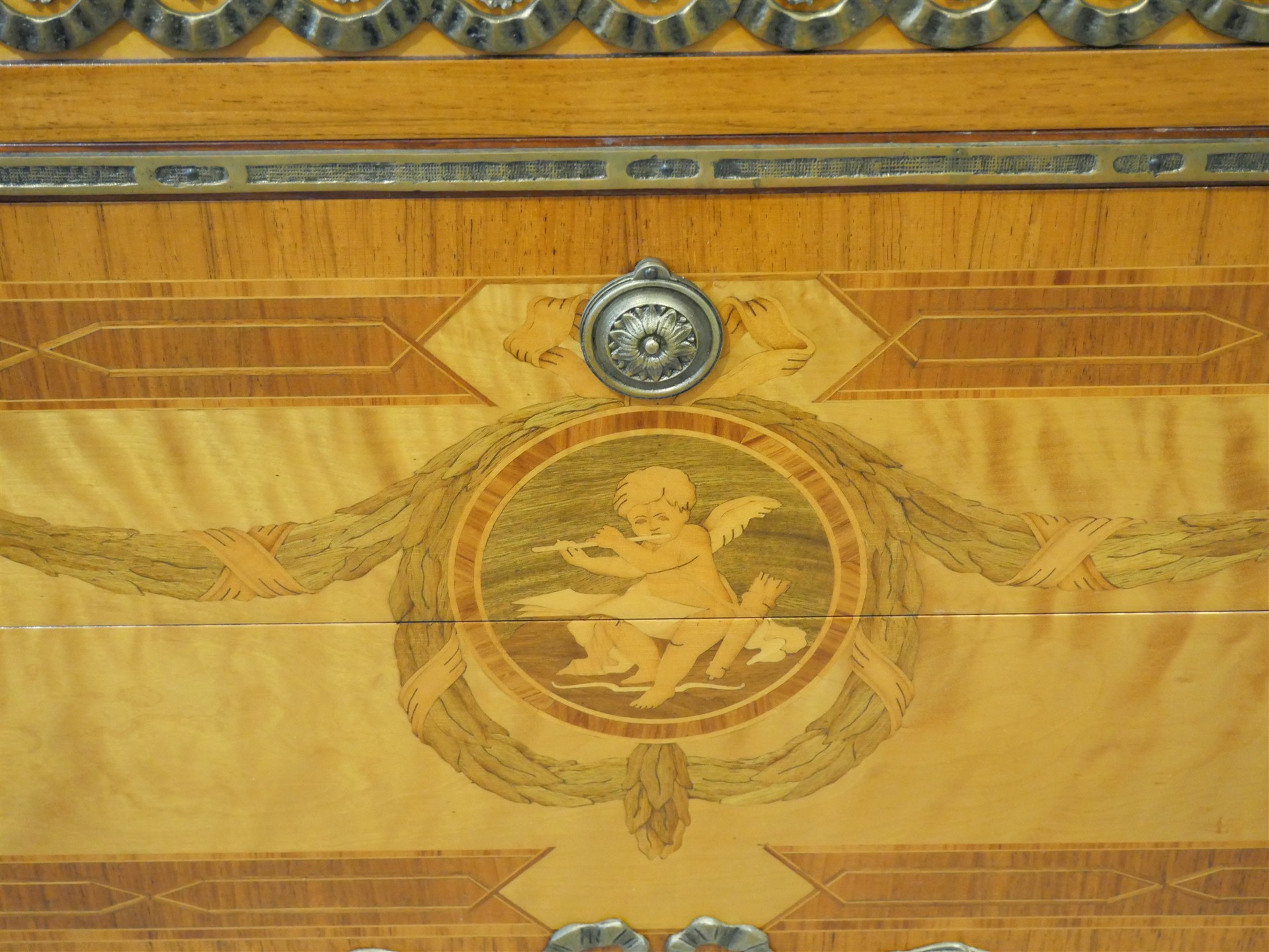 323. BYRÅ med intarsia, marmorskiva och mässingsdetaljer. H 82 cm. 95 cm. Dj 52,5 cm.