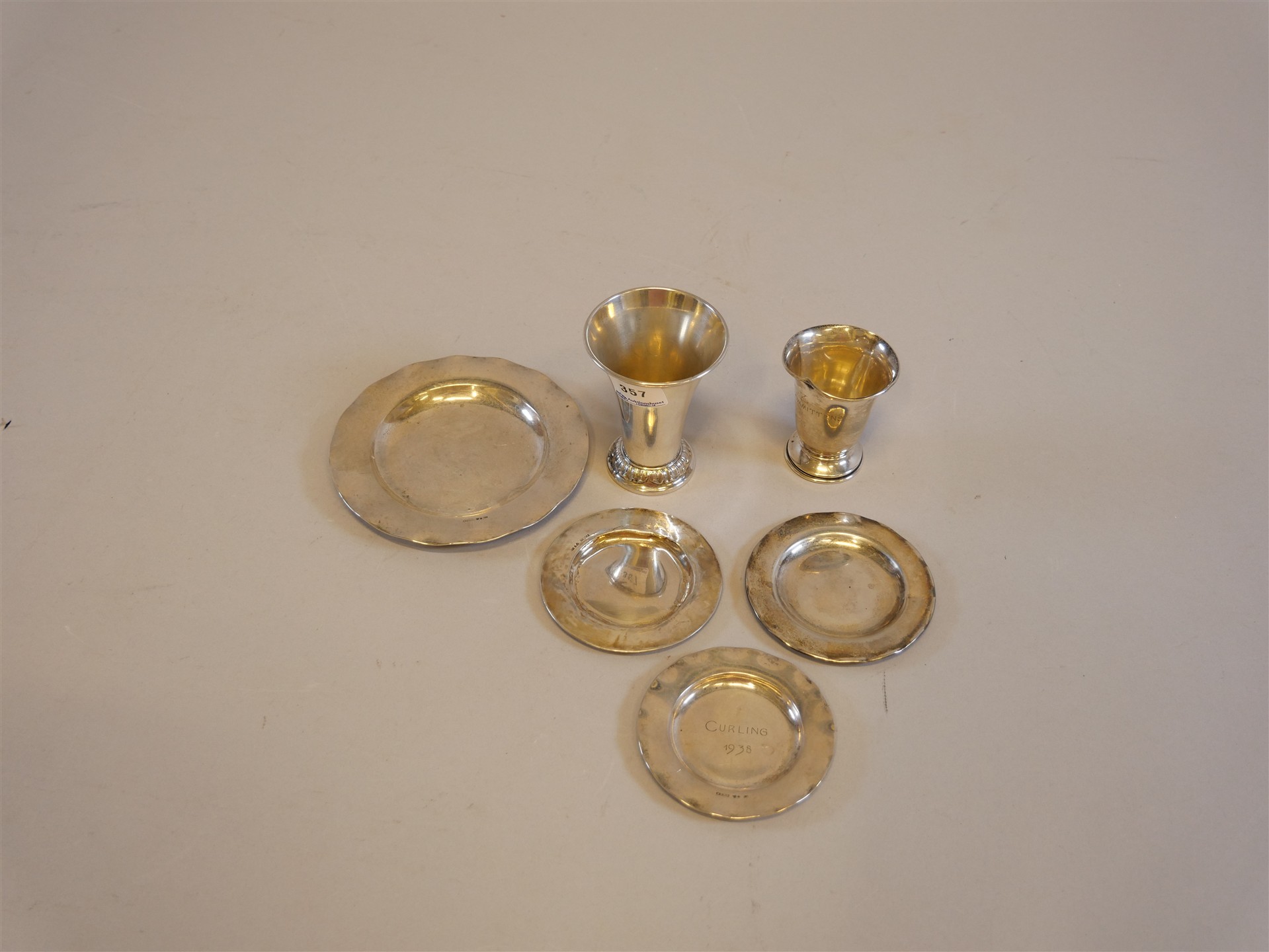 357. POKALER st varav en med gravyr och skada, silver. Fat 4 st silver. Vikt 154 gram.