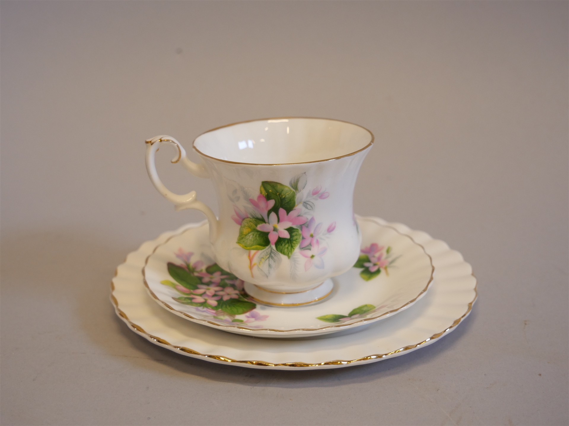 380. ROYAL ALBERT. Mayflower. Kaffekoppar 7 st. Assietter 7 st. Gräddkanna. Sockerskål.
