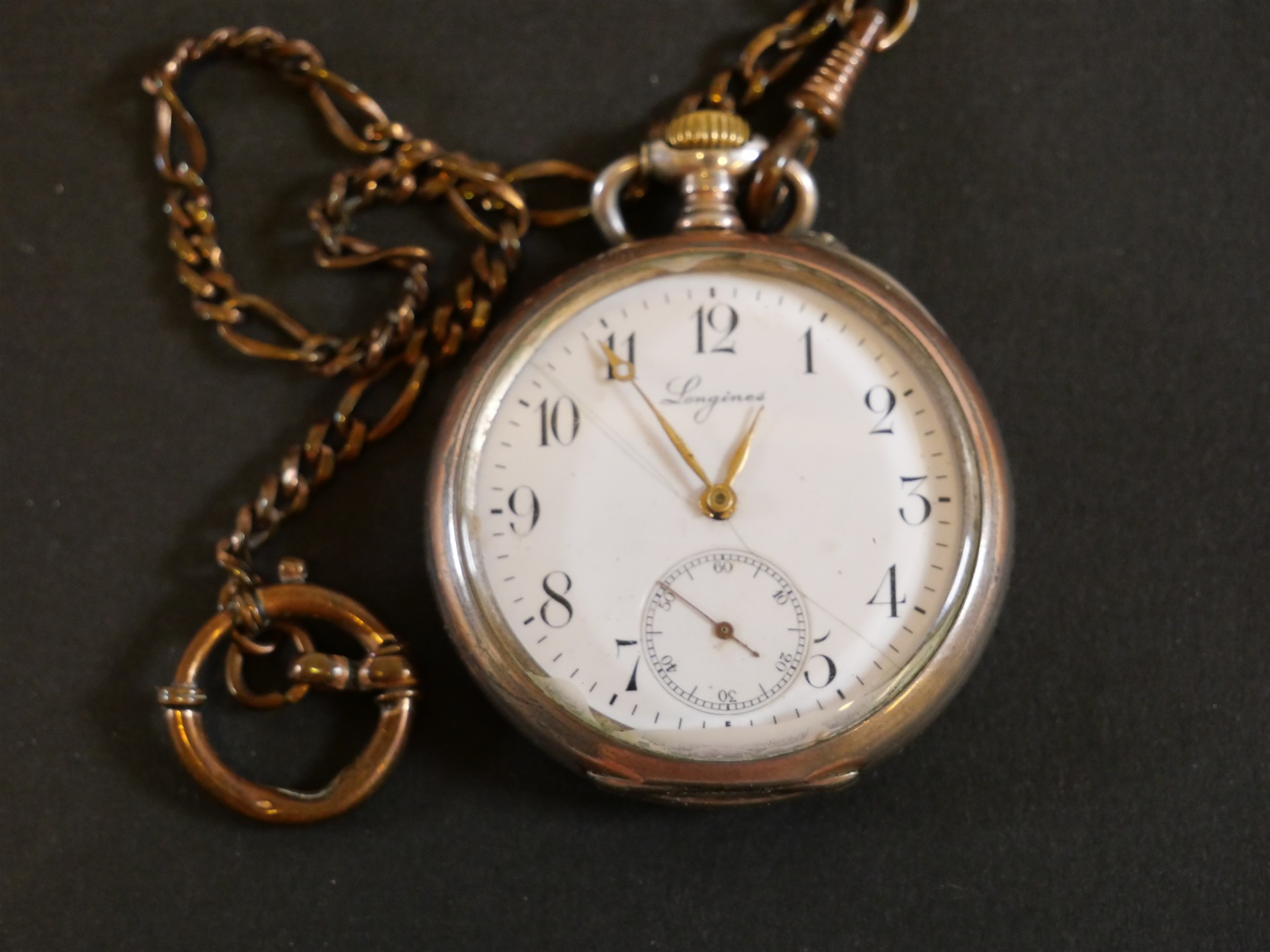 386. LONGINES. Fickur med emaljskada. Klockkedja.