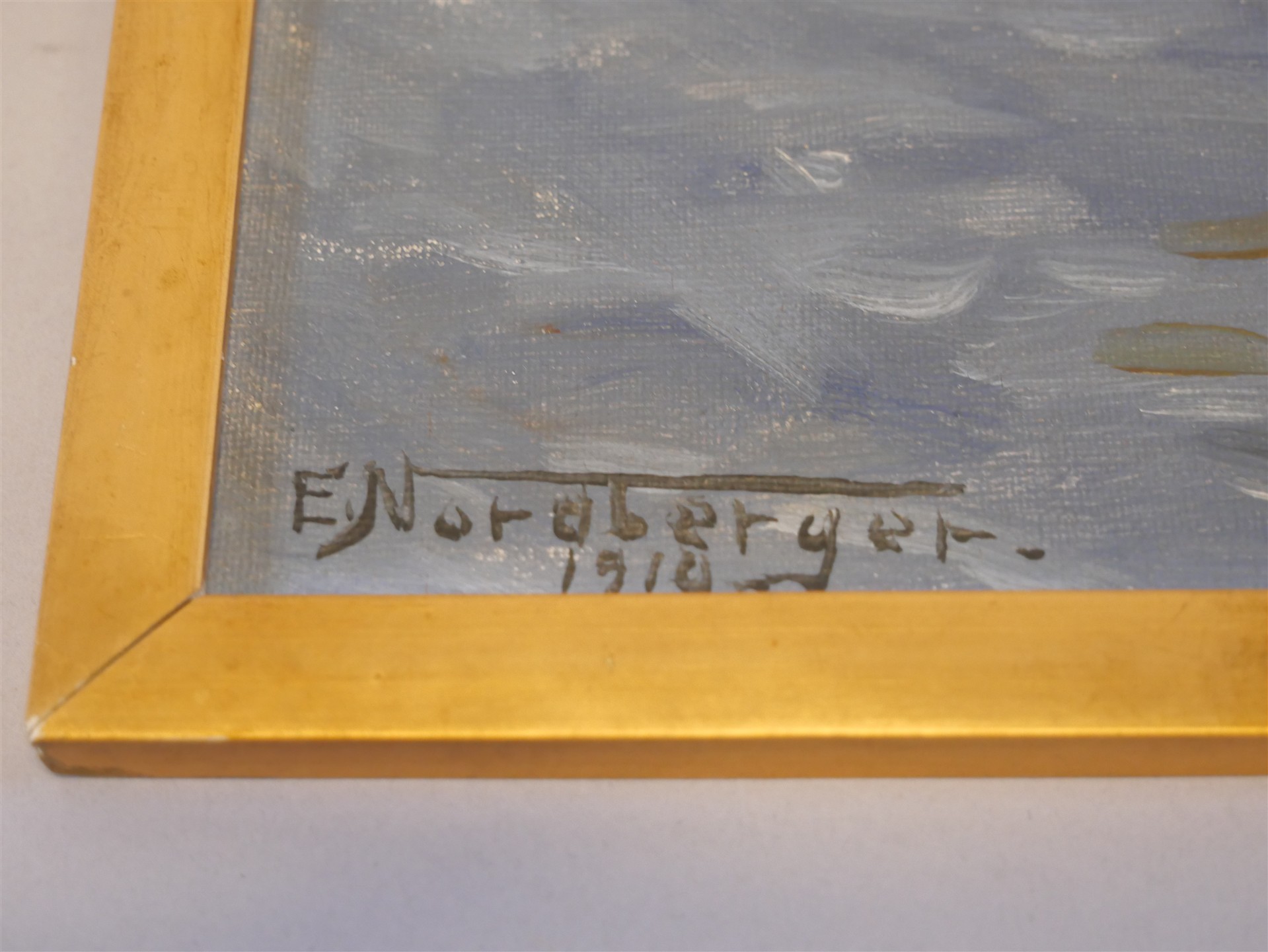 137. E NORDBERGER. Oljemålning, sign E Nordberger 1910. Pannå. Tavlans mått 16,5 x 40 cm.