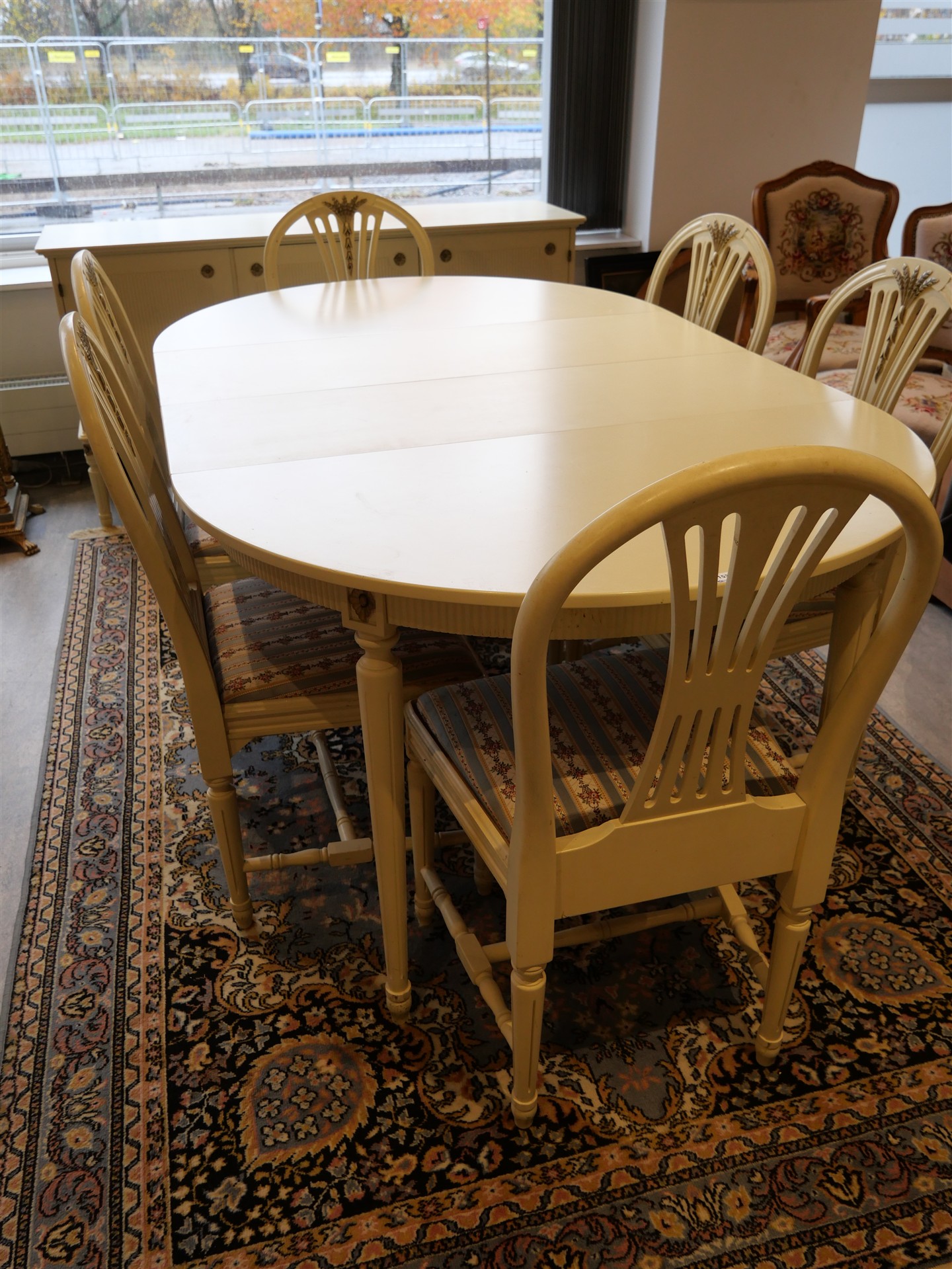 153. MATBORD 2 iläggsskivor och 6 stolar. Gust.Stil modell Axet. H 74 cm. B 104 cm. L 104 + 33,5 + 33,5 cm.