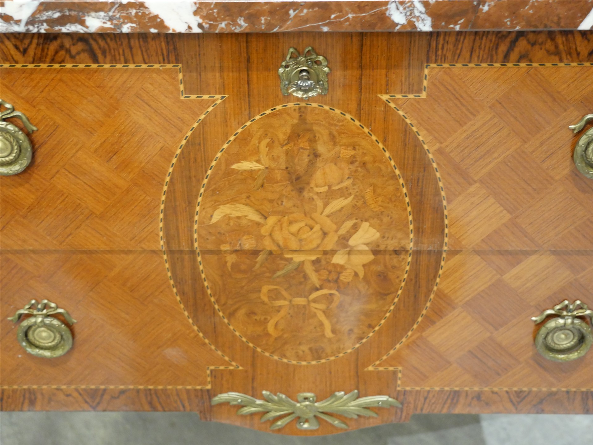 235. BYRÅ med marmorskiva, intarsia. Gust.stil. H 75 cm. B 80 cm. Dj 44 cm.