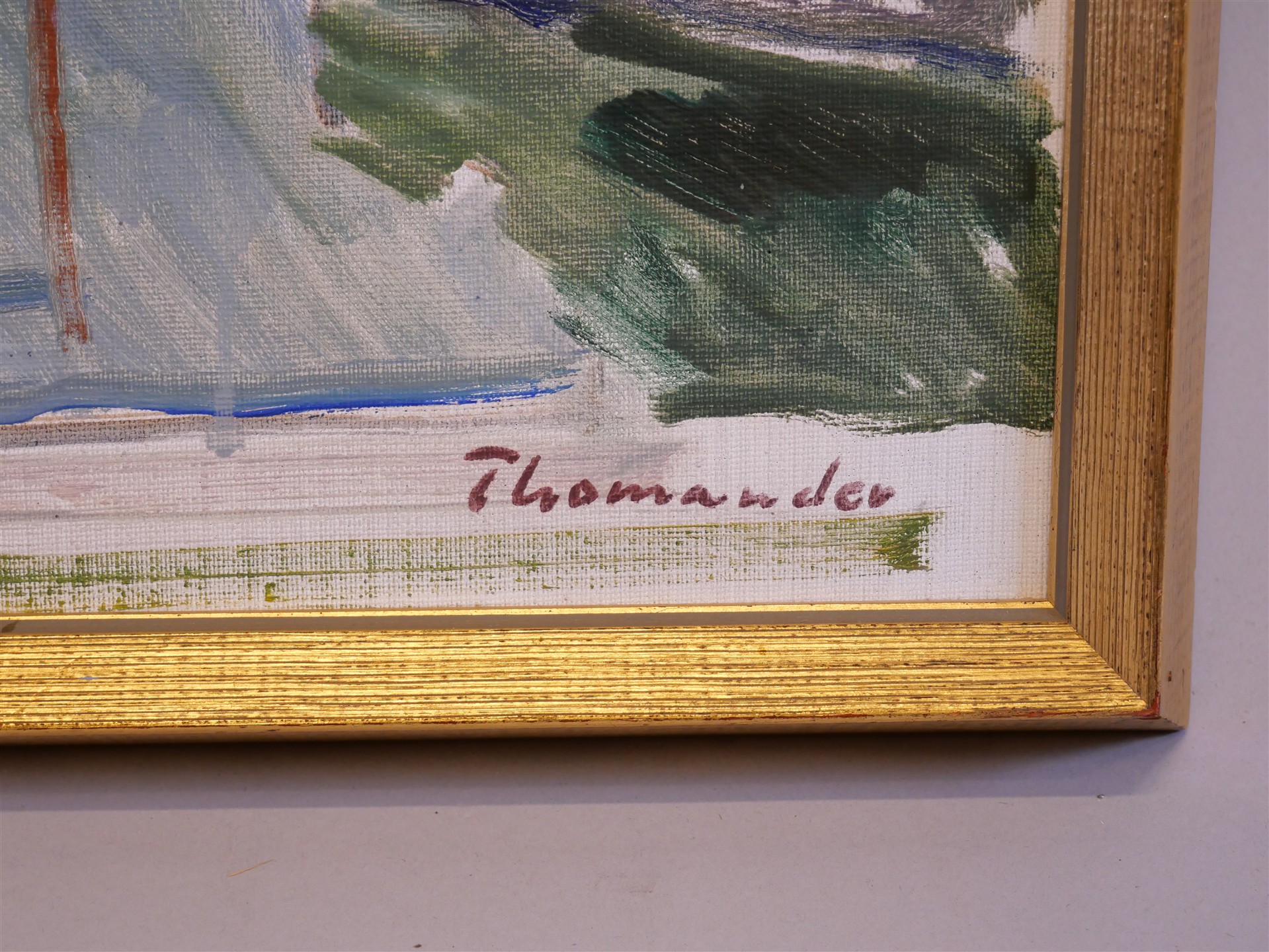 244. HARRY THOMANDER. Oljemålning, sign Thomander. Motiv från båthamnen Skebäck Örebro. Duk 55 x 64 cm.