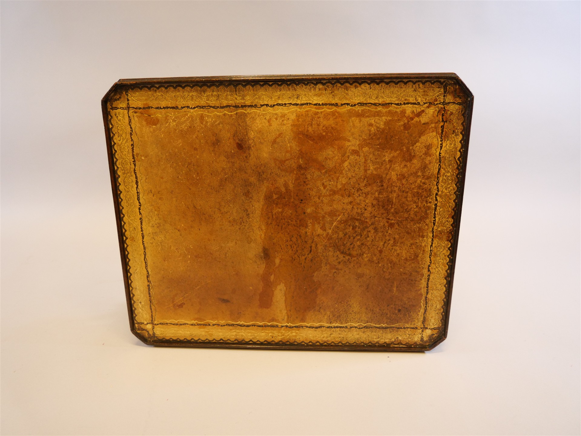297. LAMPBORD. Engelsk stil med läderklädd skiva med sarg. Åldersrelaterat slitage. H 55,5 cm. 56 x 45 cm.