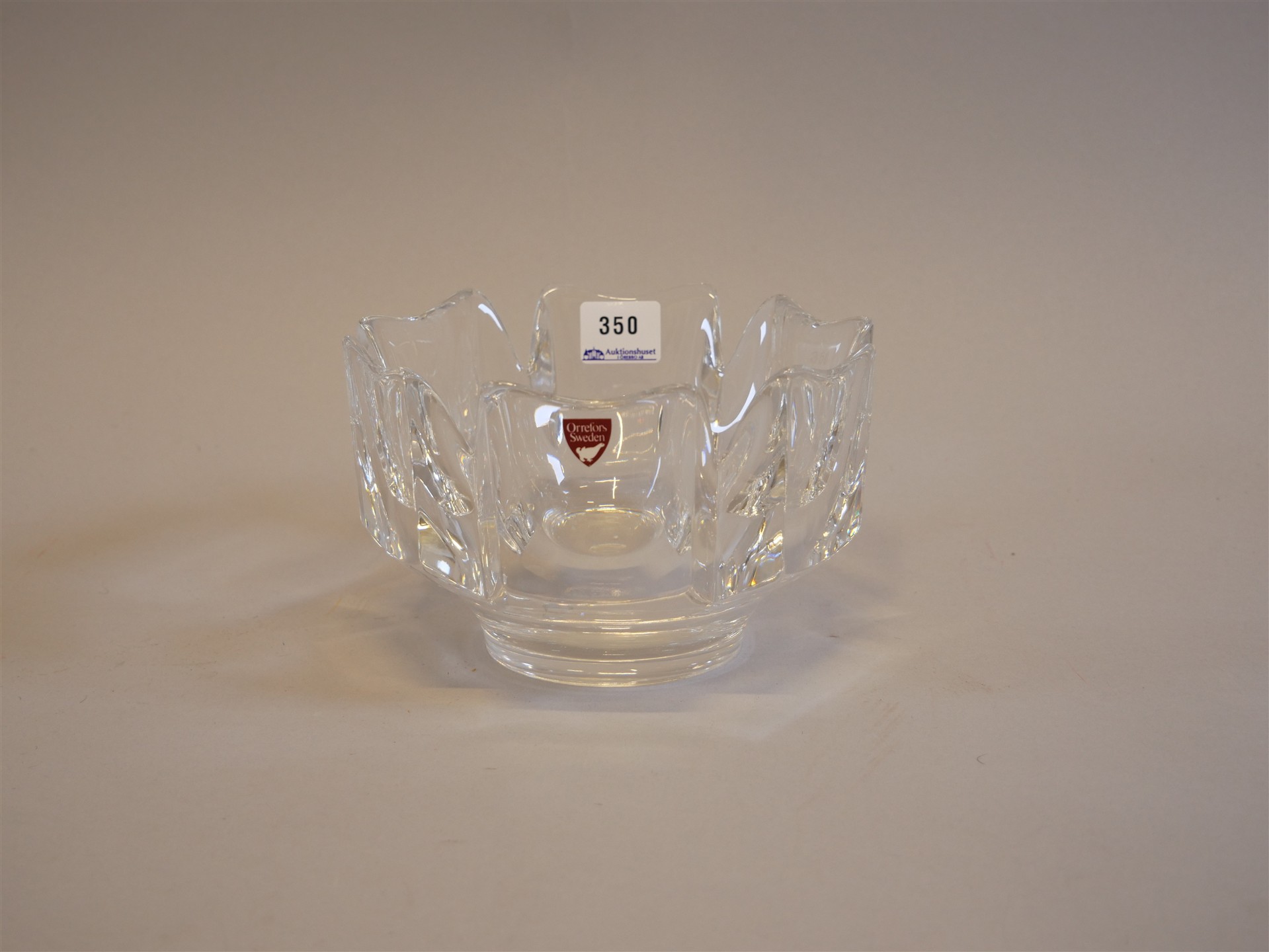 350. ORREFORS. Skål och 1 par ljuslyktor. H 9,5 resp 7,5 cm.