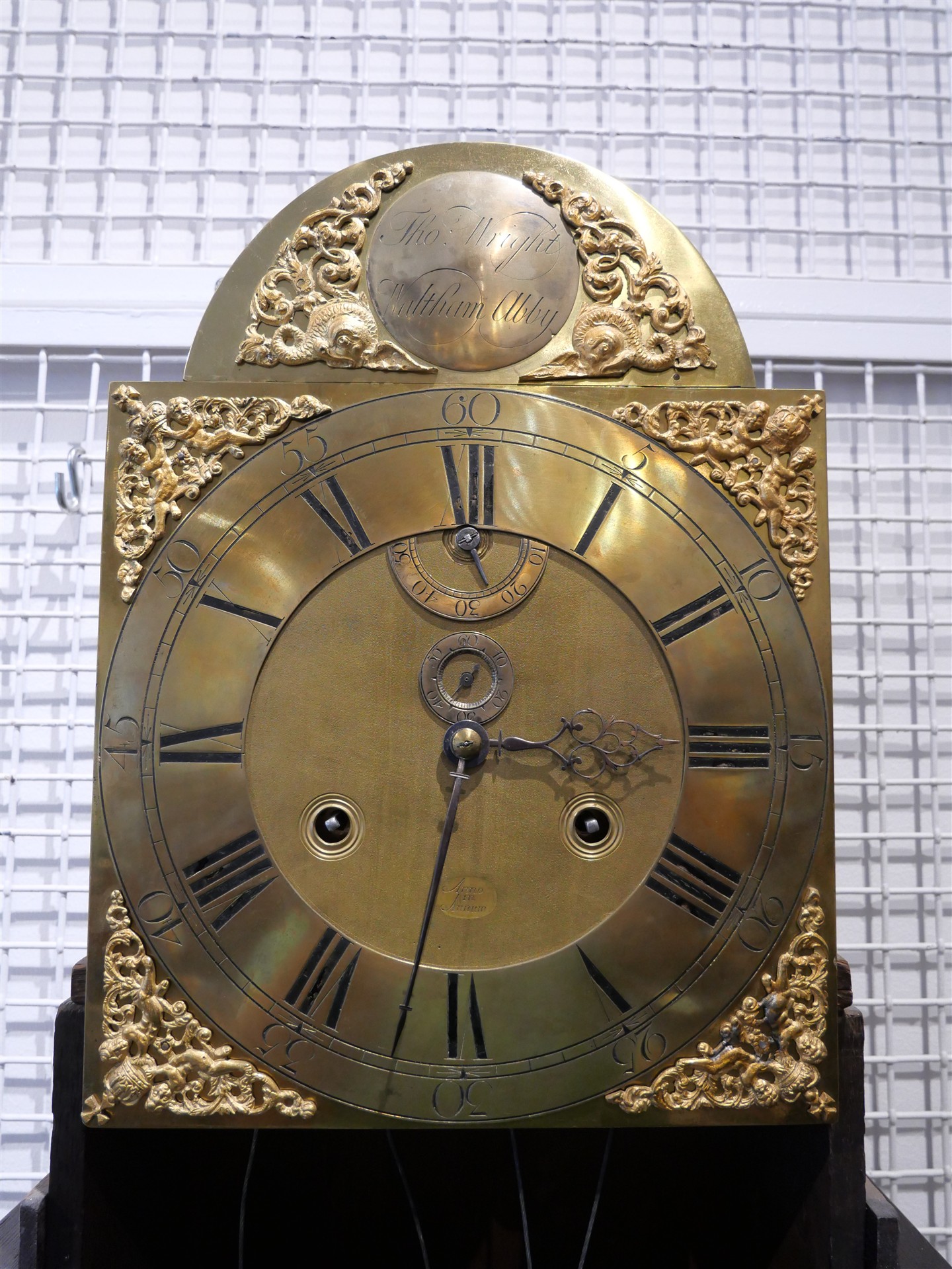 371. GOLVUR 1800-tal, fodral revoverat. Urtavlan Tho: Wright Waltham Abby Anno in Anum. Urtavla i mässing med graverad dekor. H 205 cm. B 47 cm.