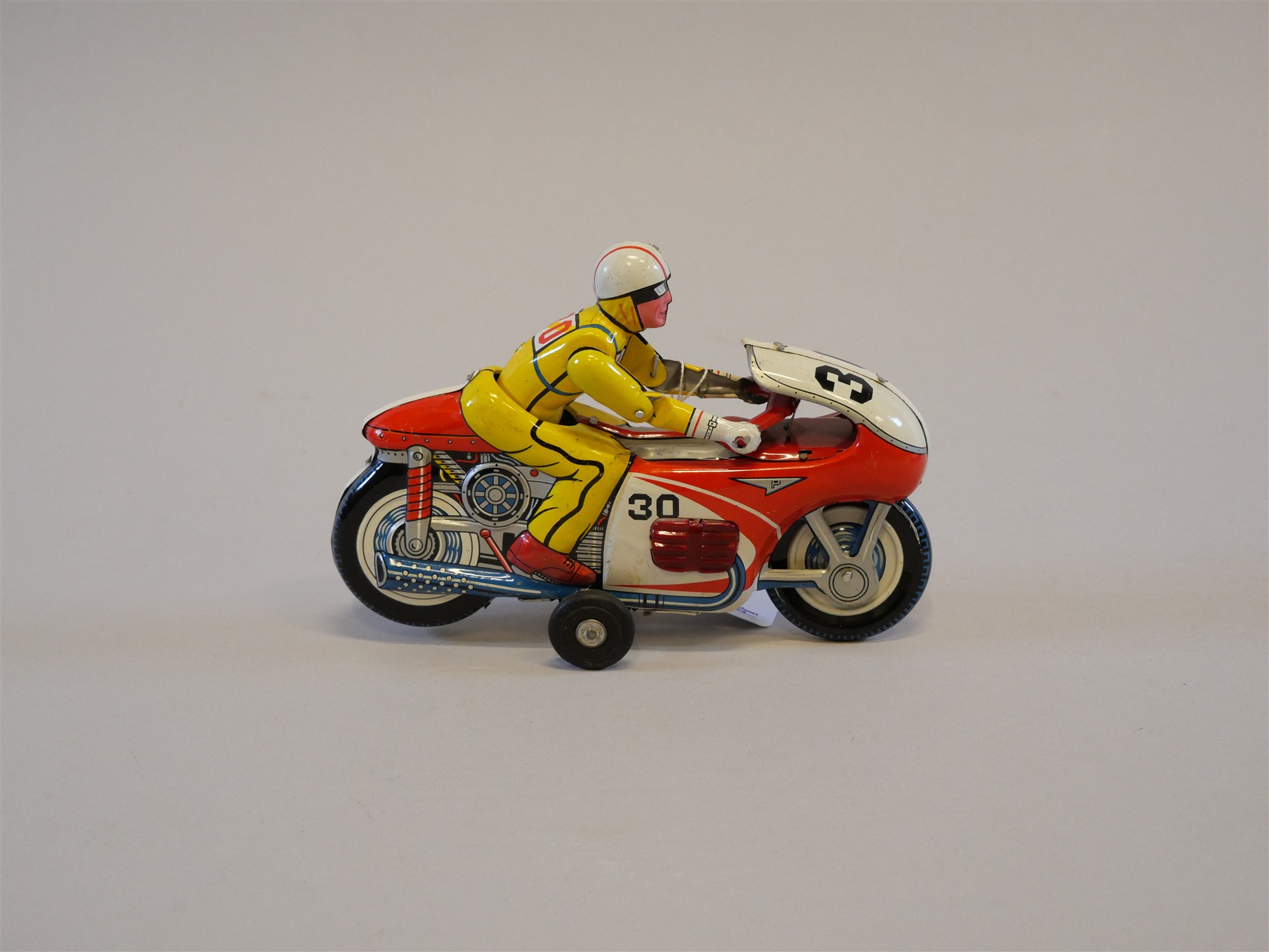 339. LEKSAK. Motorcykel, litograferad plåt. Made in Japan. L 20 cm.