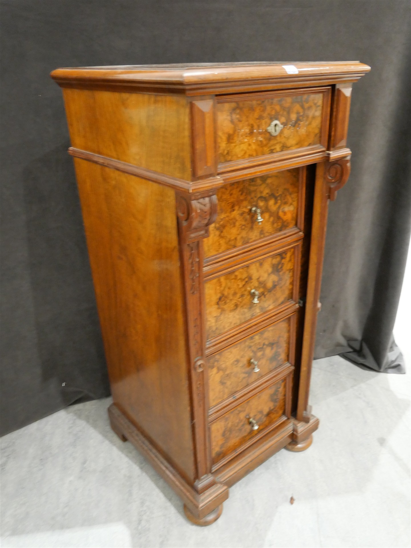 387. BYRÅ, nyrenässans, bl a valnötsfanér 5-lådig. Sekelskiftet 1900. H 108 cm. B 47,5 cm. Dj 50 cm.