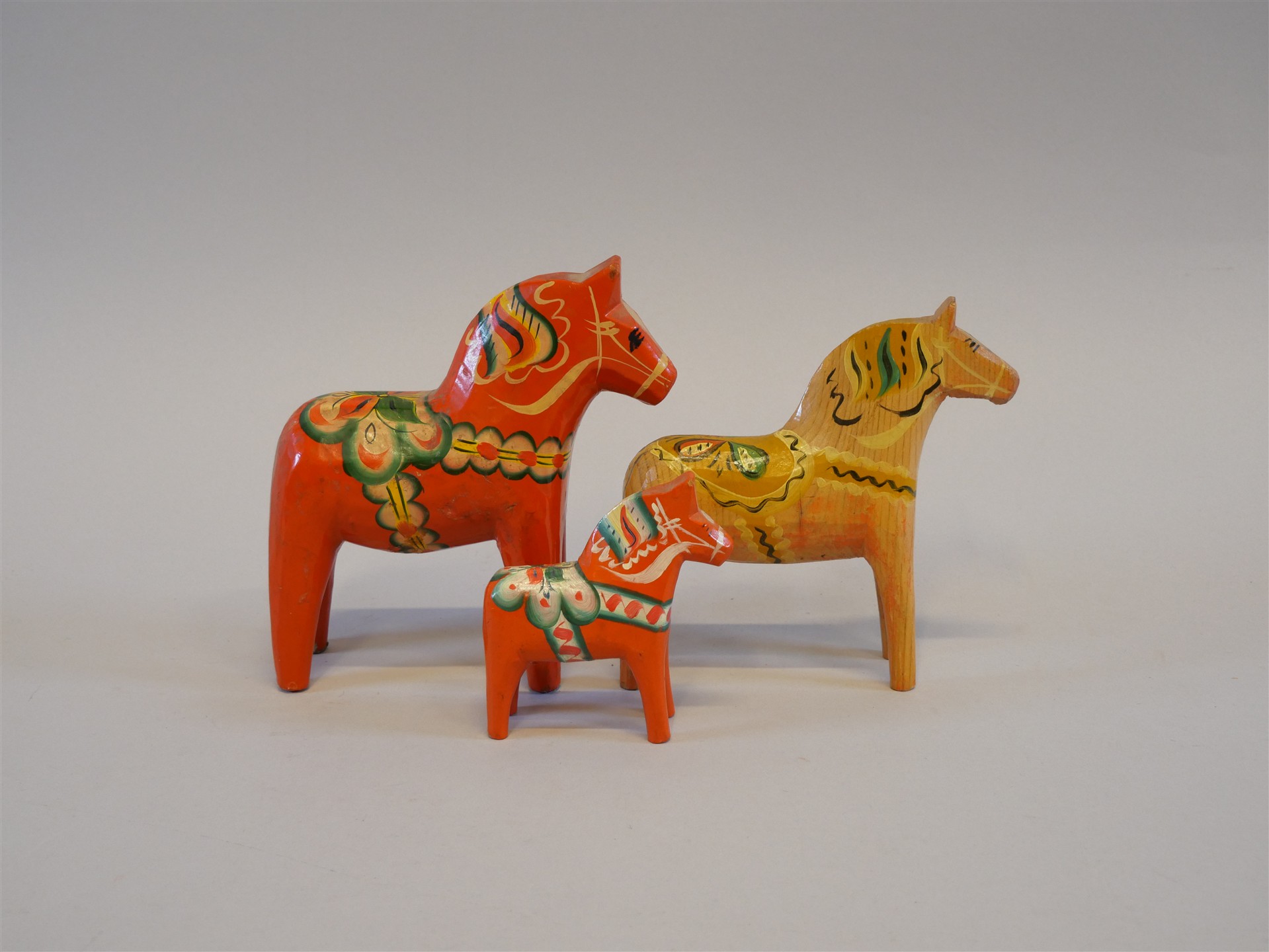 391. DALAHÄSTAR 3 st varav en etikettmärkt Dalahemslöjd Tillv G.A. Olsson Nusnäs Mora Sweden. H 10, 15 resp 17 cm.