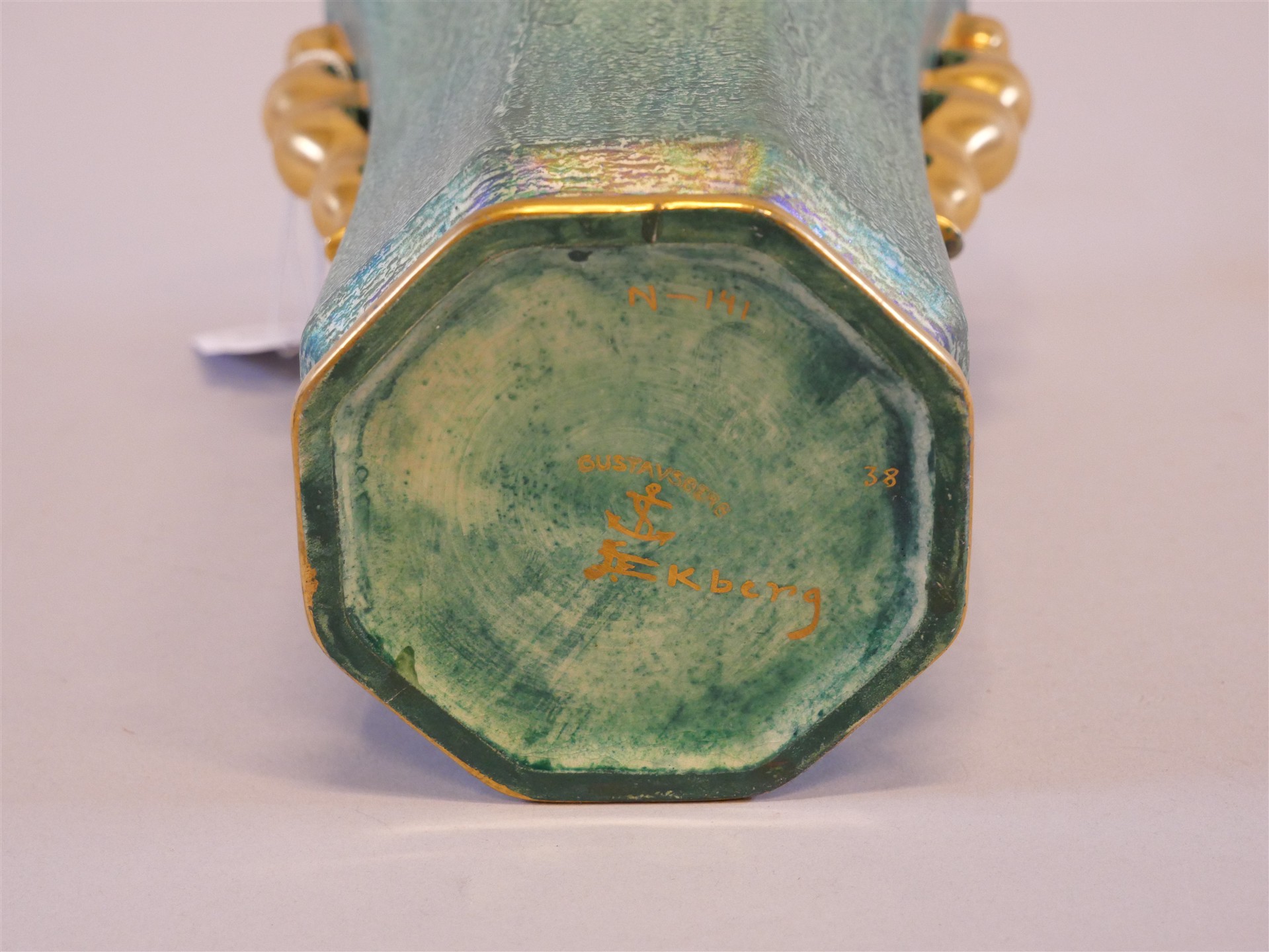 393. JOSEF EKBERG, Gustavsberg. Lockurna, flintgods, lysterglasyr i grönt med gulddekor, sign J Ekberg N-141. H ca 28 cm.