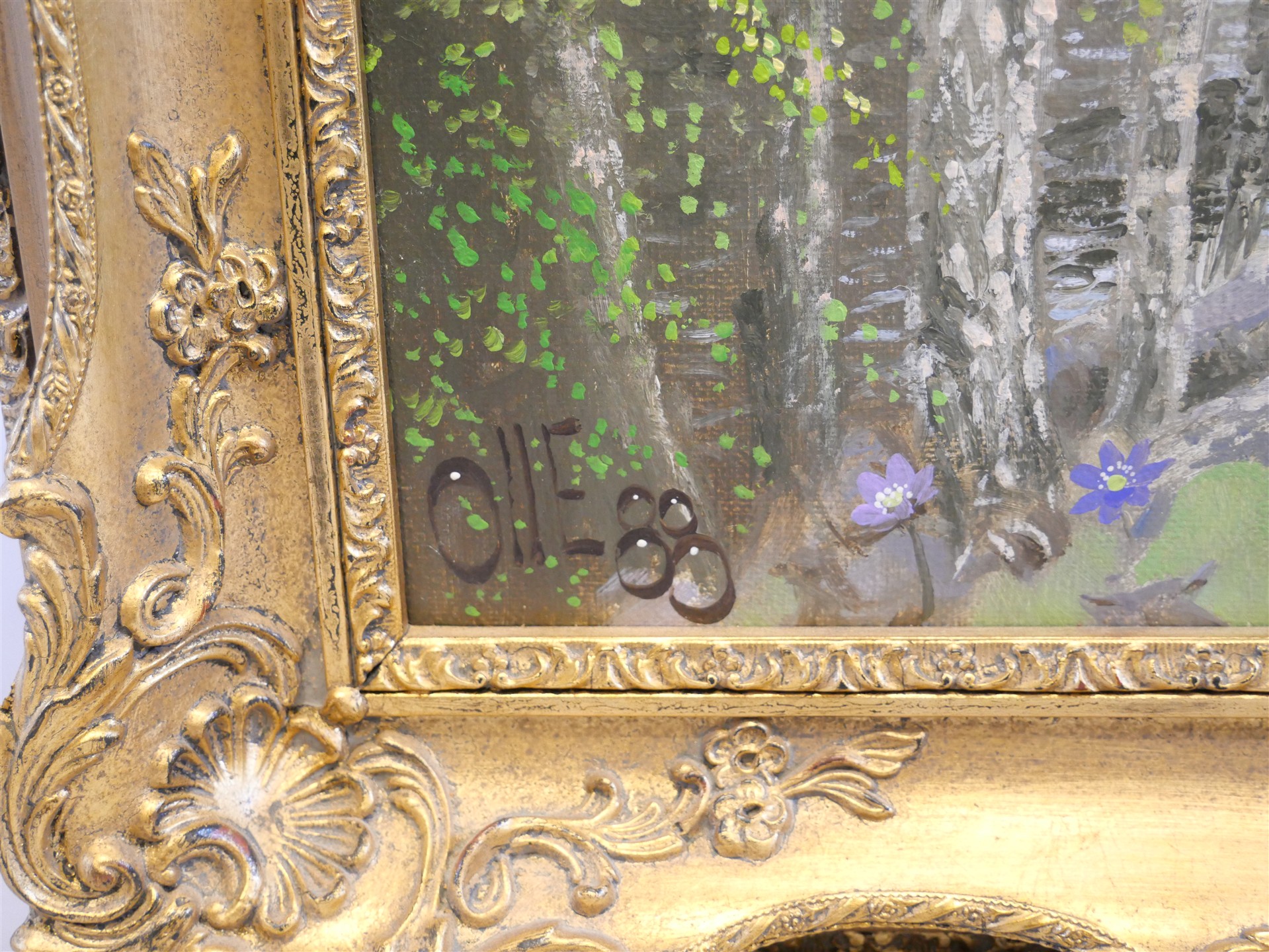 425. OLLE "Droppen" Eriksson. Oljemålning, sign Olle, "Fågelsång om våren 1988". Duk 55 x 46 cm.