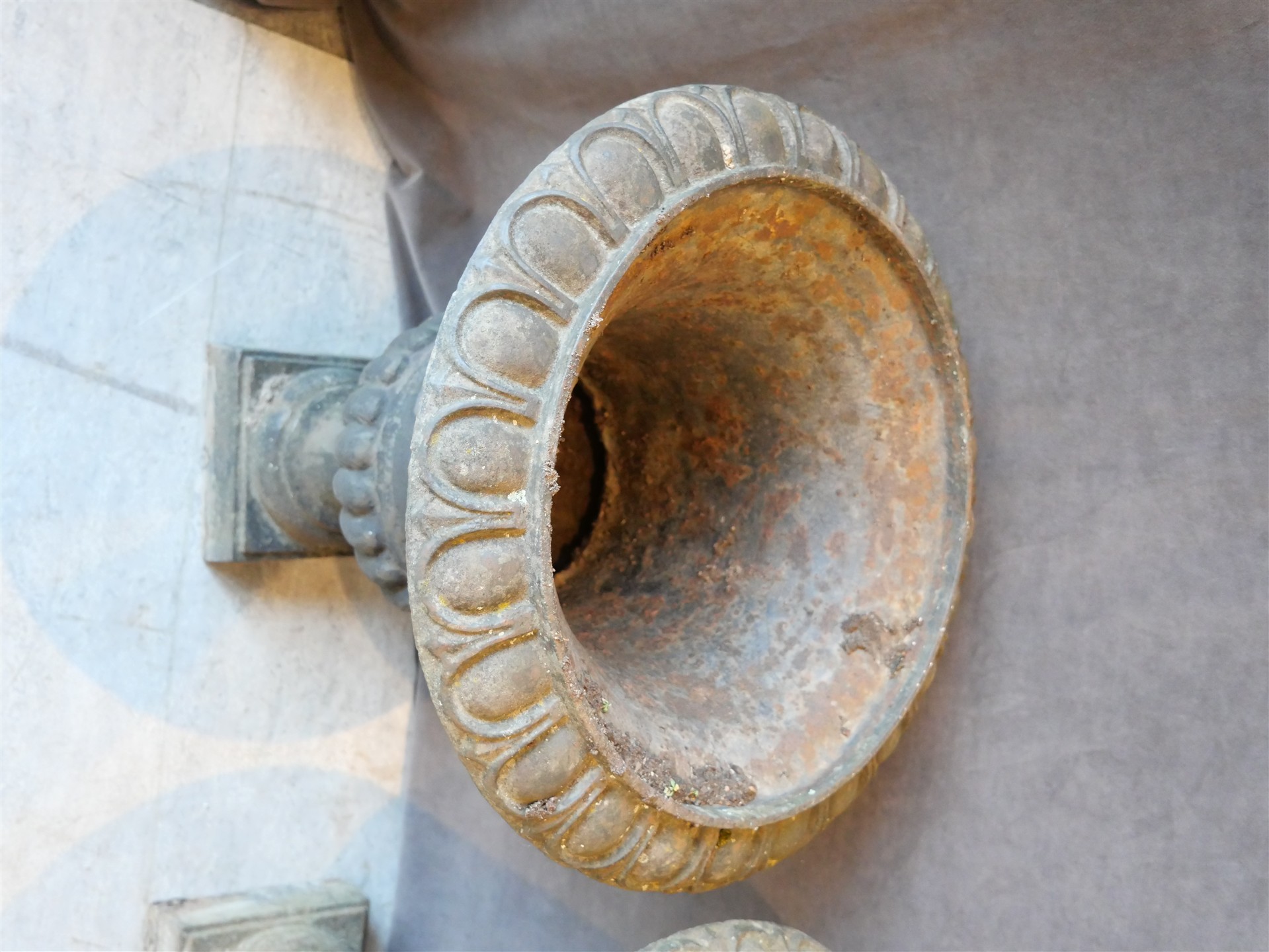 442. TRÄDGÅRDSURNOR 1 par, gjutjärn med rostangrepp. H 62 cm. Diam 49 cm.