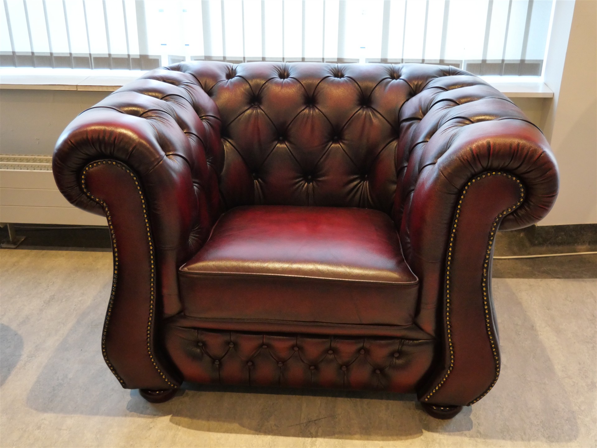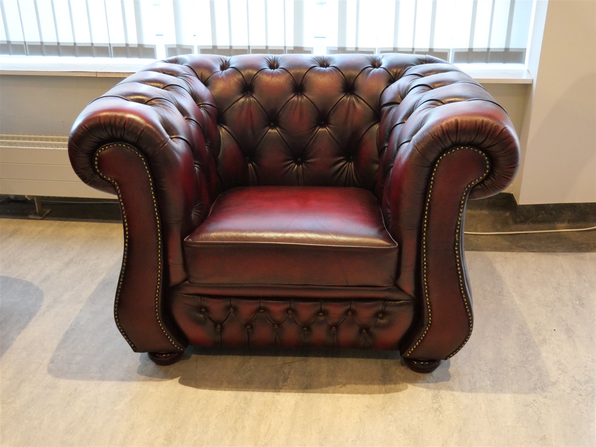 450. SOFFA 3-sits. Fåtöljer 2 st. Chesterfieldmodell, Skai. Oxblodsfärg. En av fåtöljerna har några färgskiftningar. Soffans mått L 215 cm. Dj 84 cm. Fåtöljen B 117 cm. Dj 84 cm.