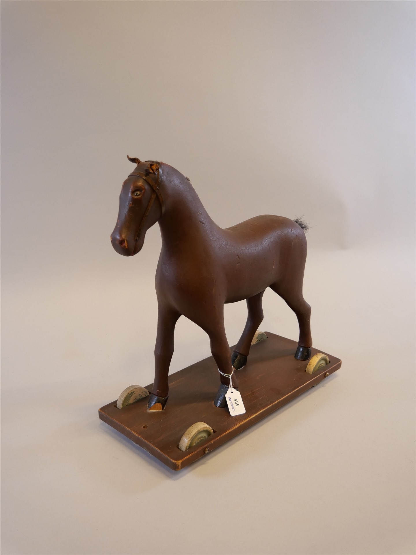 456. TRÄSKULPTUR, häst på hjulplatta. Bruksslitage. Sekelskiftet 1900. H 45 cm. L 45 cm.