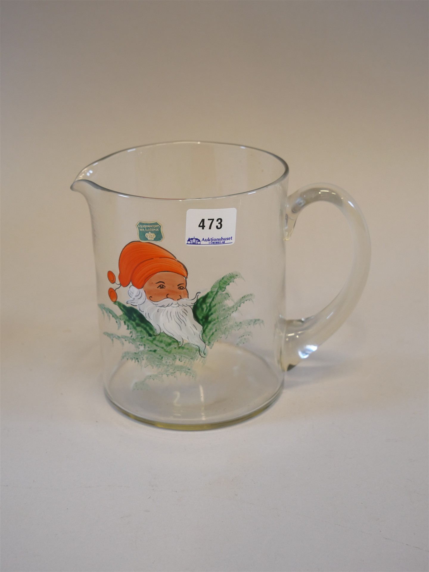 473. GLÖGGSET. Kanna och 6 muggar med tomtemotiv. AB Hofmantorps Nya Glasbruk. Kannans höjd 14 cm.