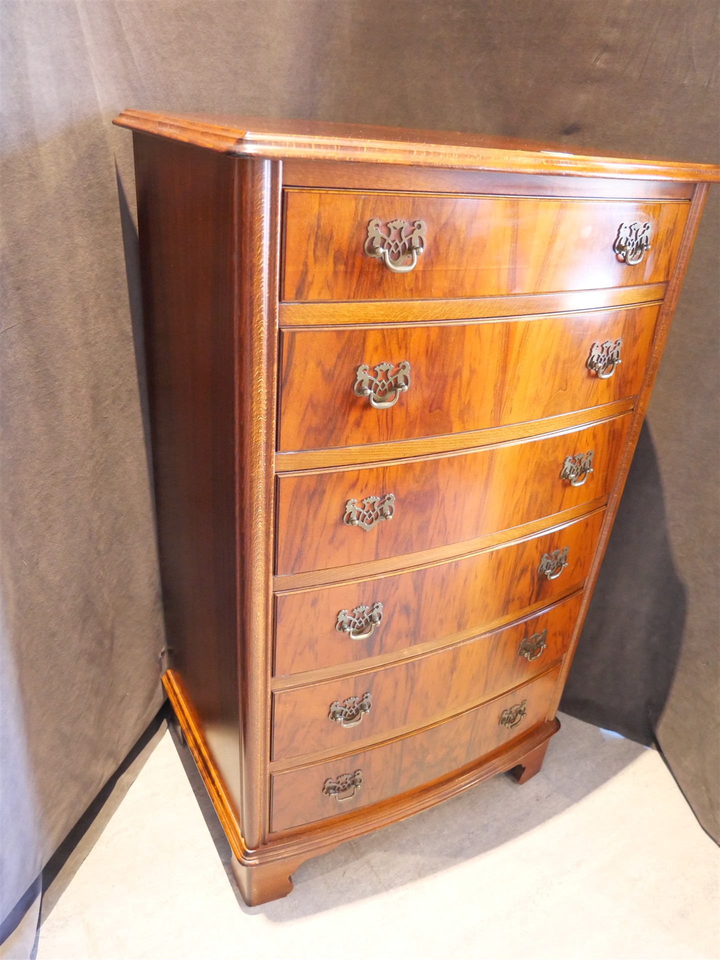502. BYRÅ, 6-lådig. Idegran, engelsk sitl. H 107 cm. B 64 cm. Dj 46 cm.