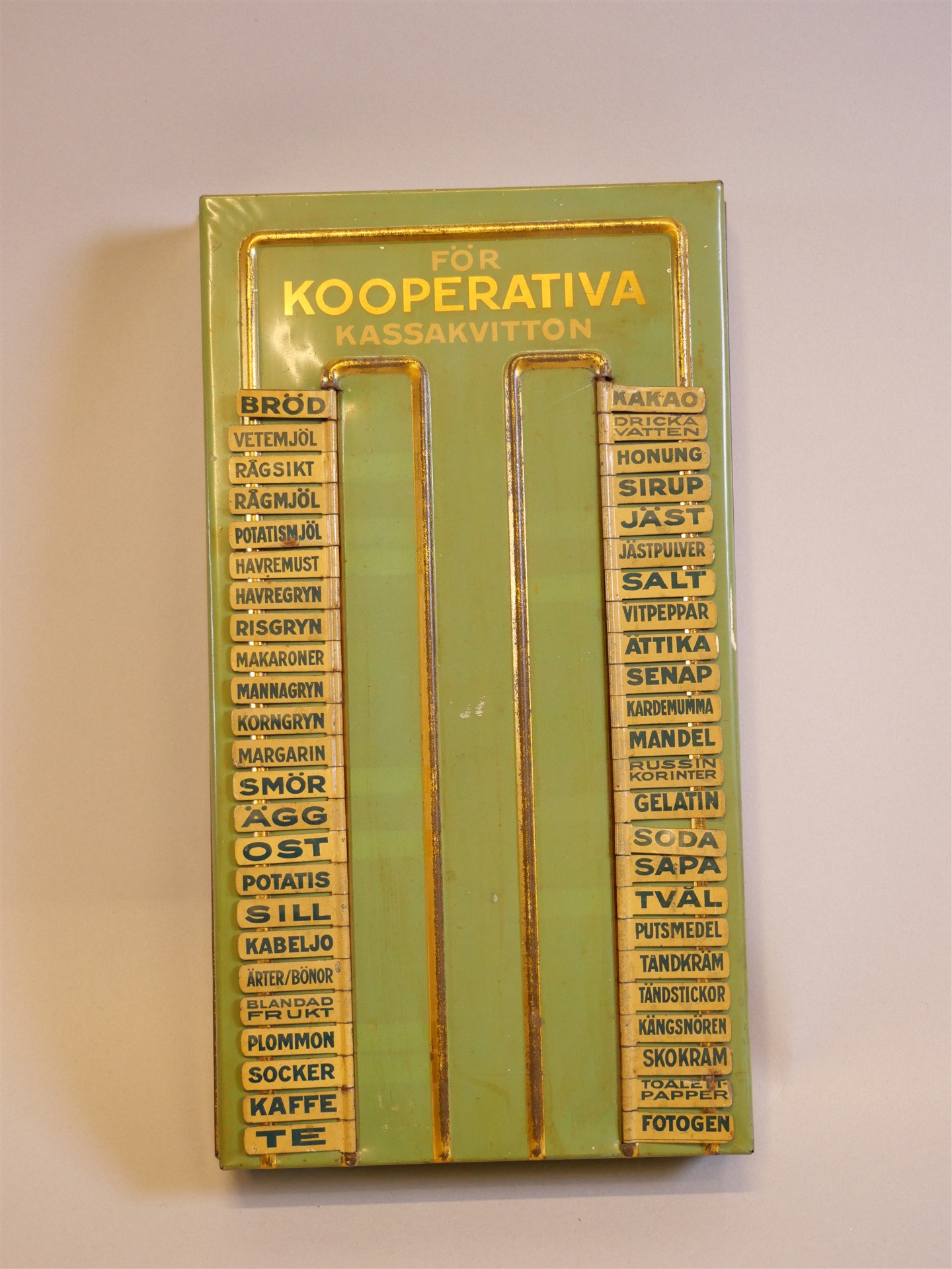 551. INKÖPSTAVLA. För Kooperativa kassakvitton. 1900-talets första hälft. Lackerad plåt. Smärre bruksspår. Lucka på baksidan för kvitton. Mått ca 32 x 17 cm.