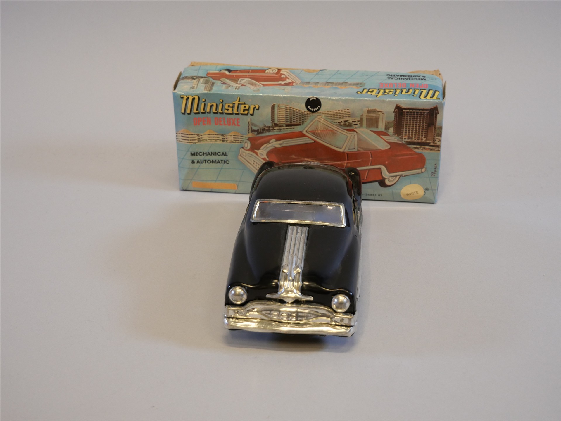 087. LEKSAKSBIL. Minister Open Deluxe. Litograferad plåt, made in Japan. H 8 cm. L 25 cm. Originalförpackning något defekt.