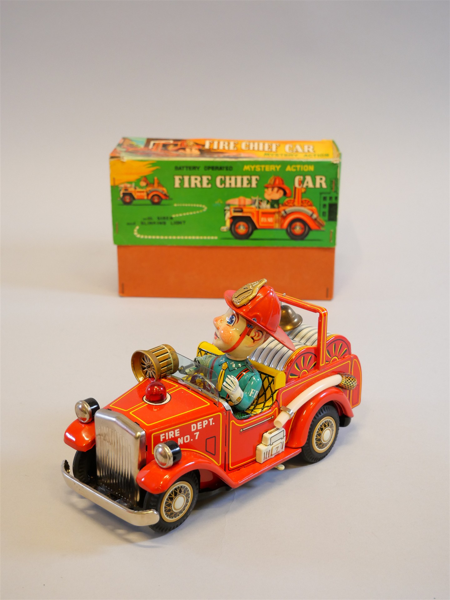 090. LEKSAKSBIL. Fire Chieft Car. Litograferad plåt. Made in Japan. H 17,5 cm. L 25 cm. Originalförpackning.