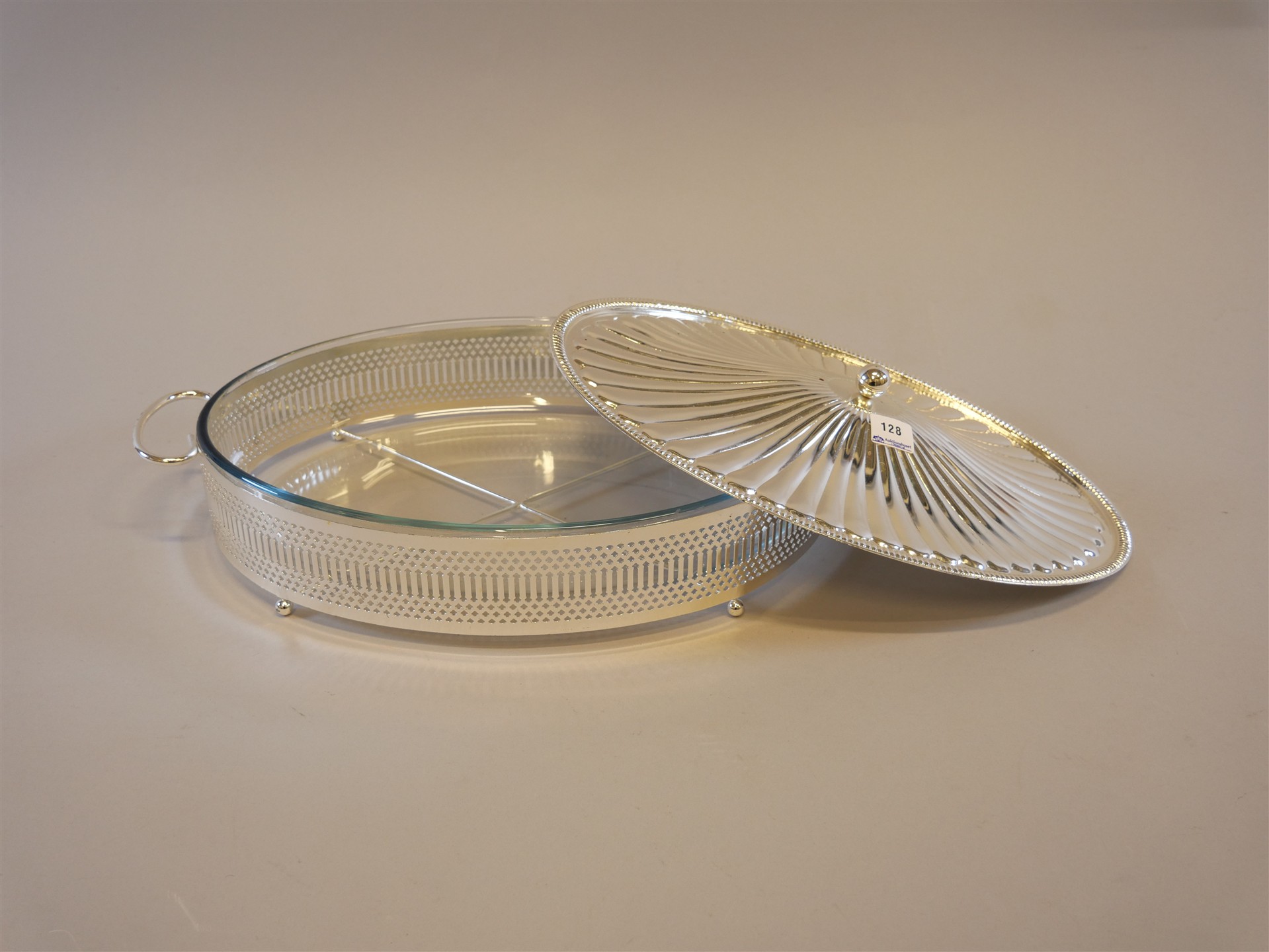 128. UGNSELDFAST FORM med lock o ställning i vitmetall. L. 43 cm.