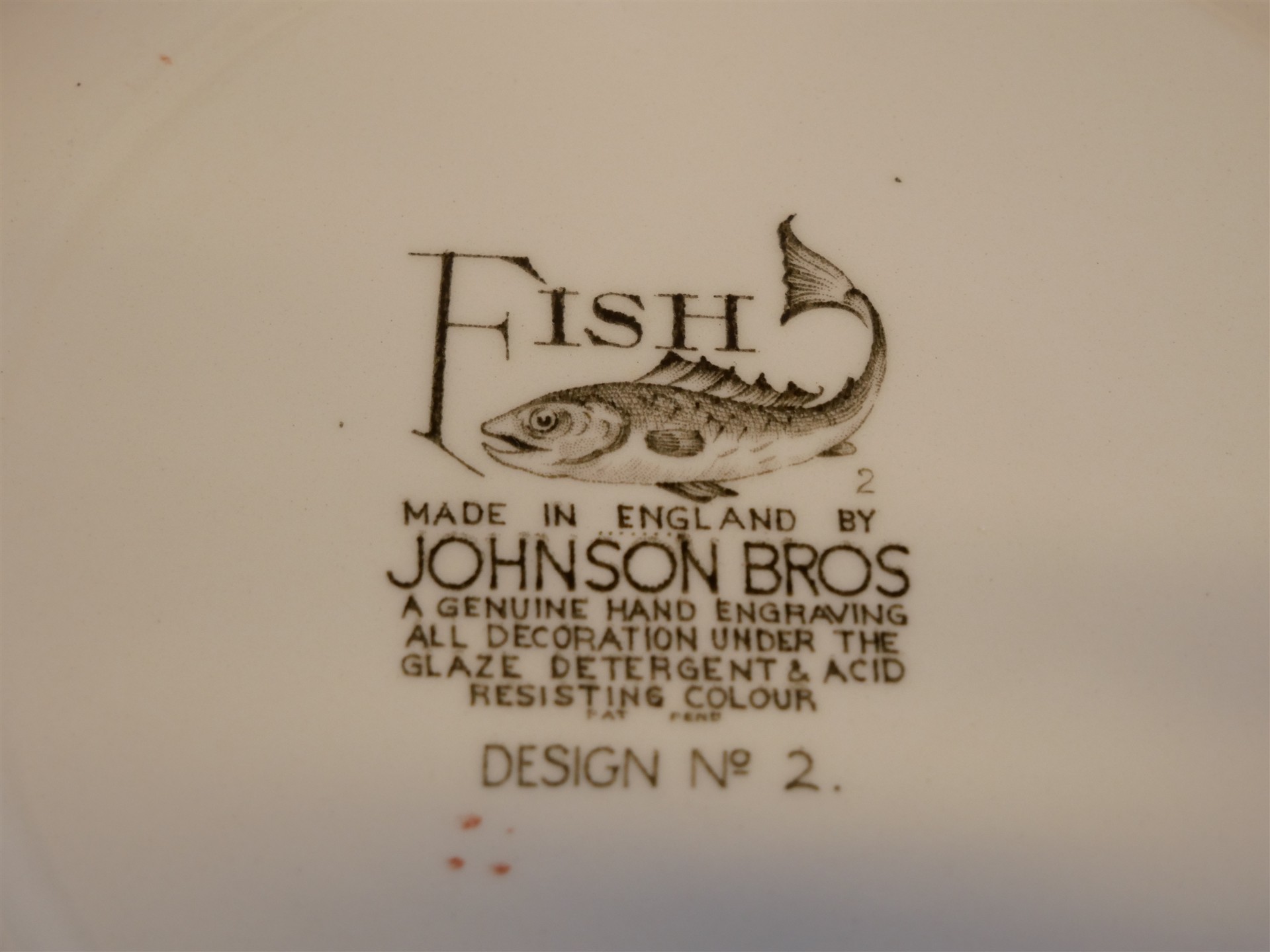 015. JOHNSON BROS. Fisktallrikar 7 st 26 x 24 cm. Fat 32 x 23 cm.