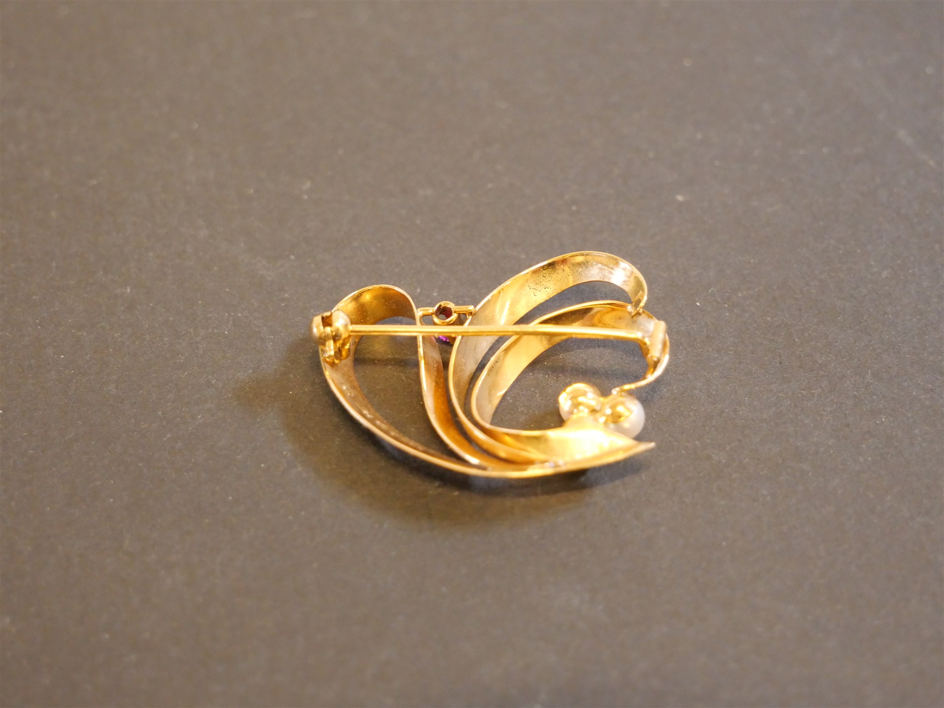 306. BROSCH 18K med tre pärlor och en sten. 30 x 23 mm. Bruttovikt 3,6 gram.