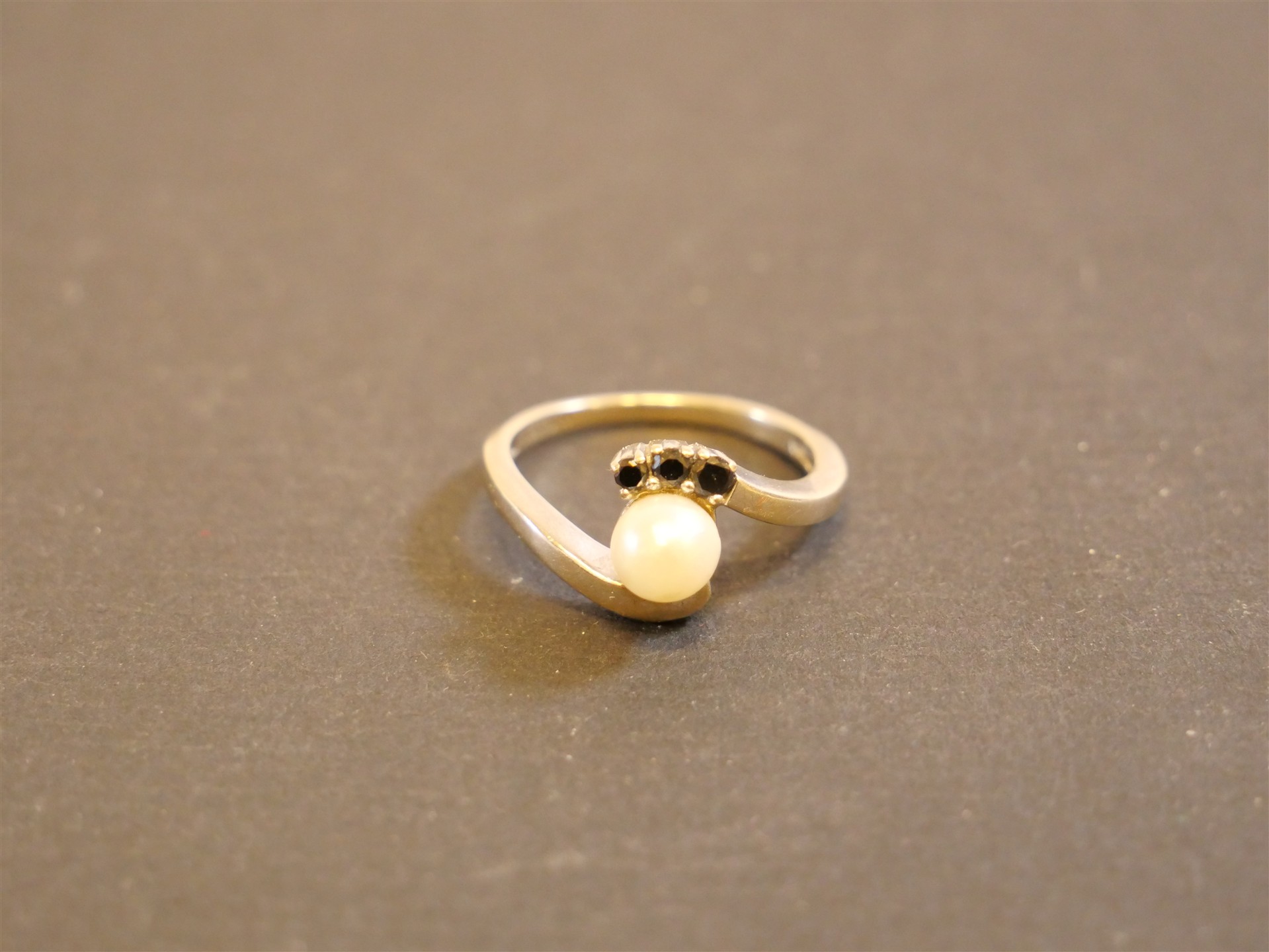 318. RING 18K vg med pärla och 3 stenar. RIngens mått 17 mm. Bruttovikt 3,3 gram.
