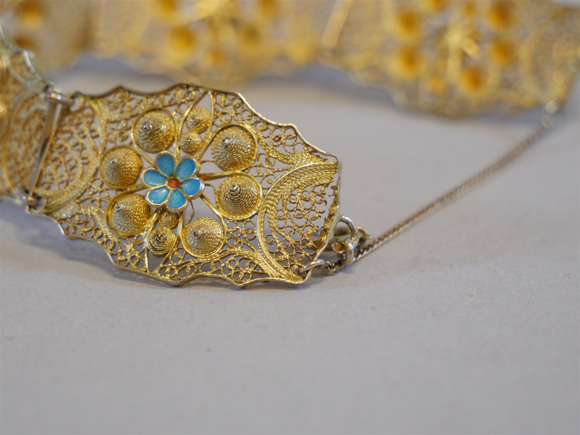361. FILIGRANARMBAND med blå emaljblommor. Förgyllt silver. Liten skada vid låset.