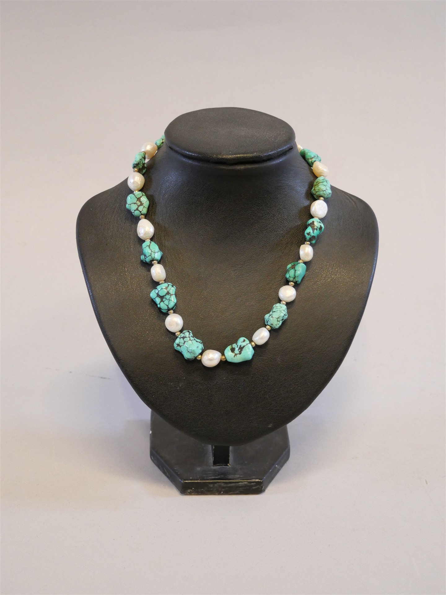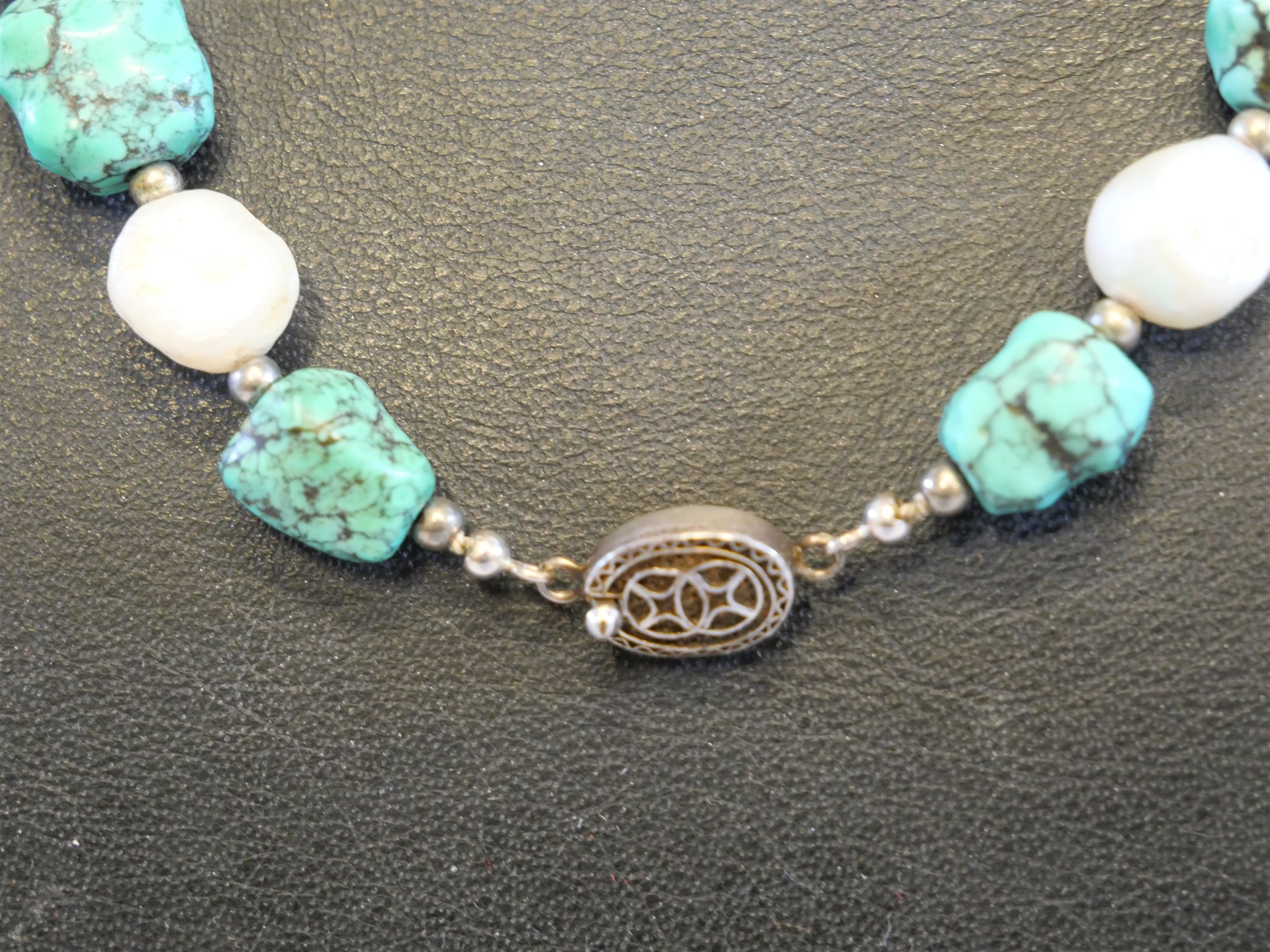 384. COLLIER med Turkoser och silverlås. L 48 cm.