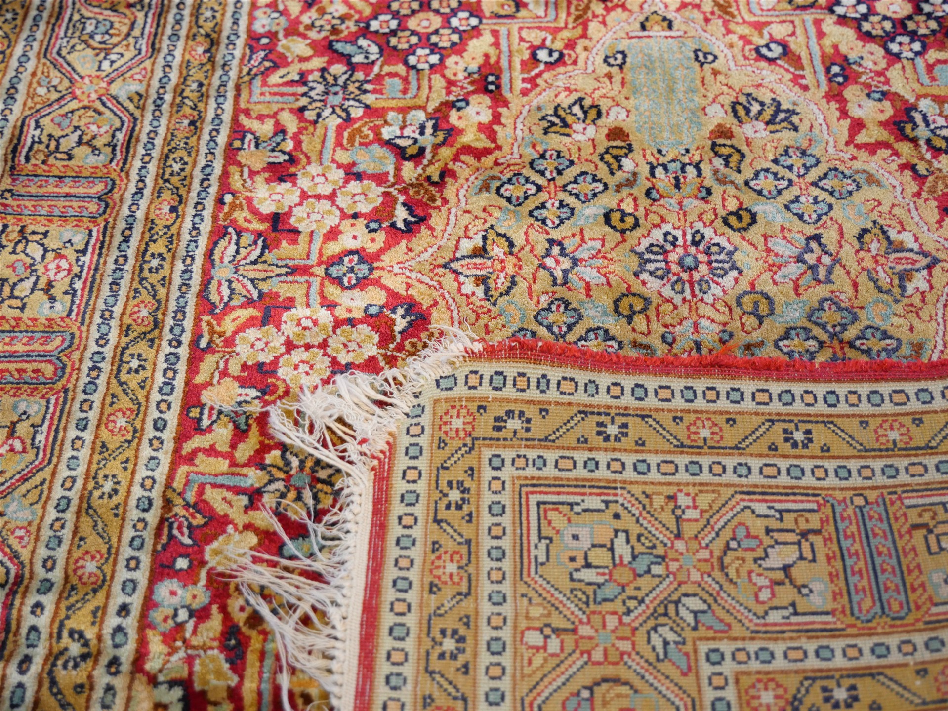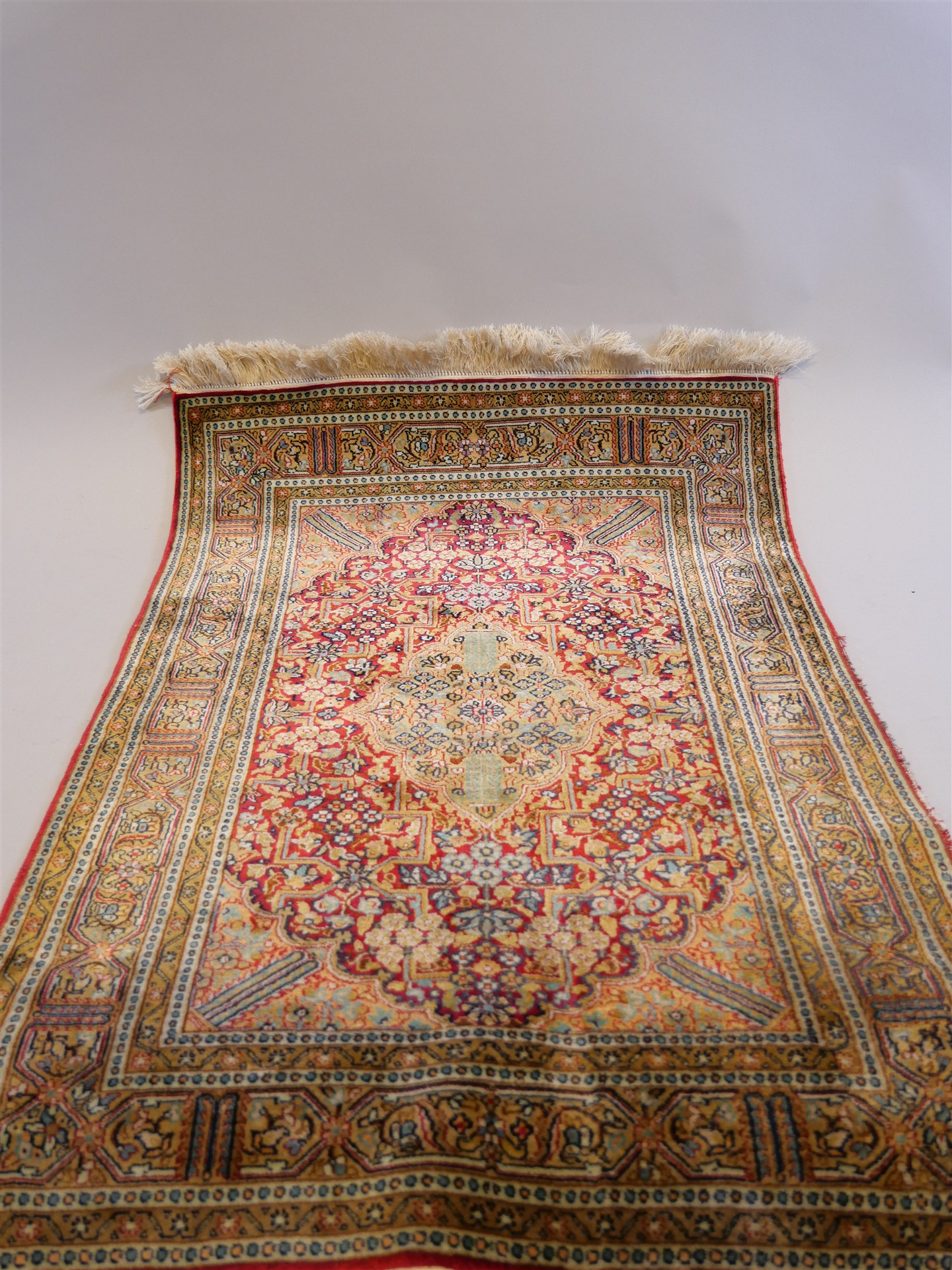389. MATTA, handknuten, silke. Skadad i ena hörnet. 100 x 64 cm.